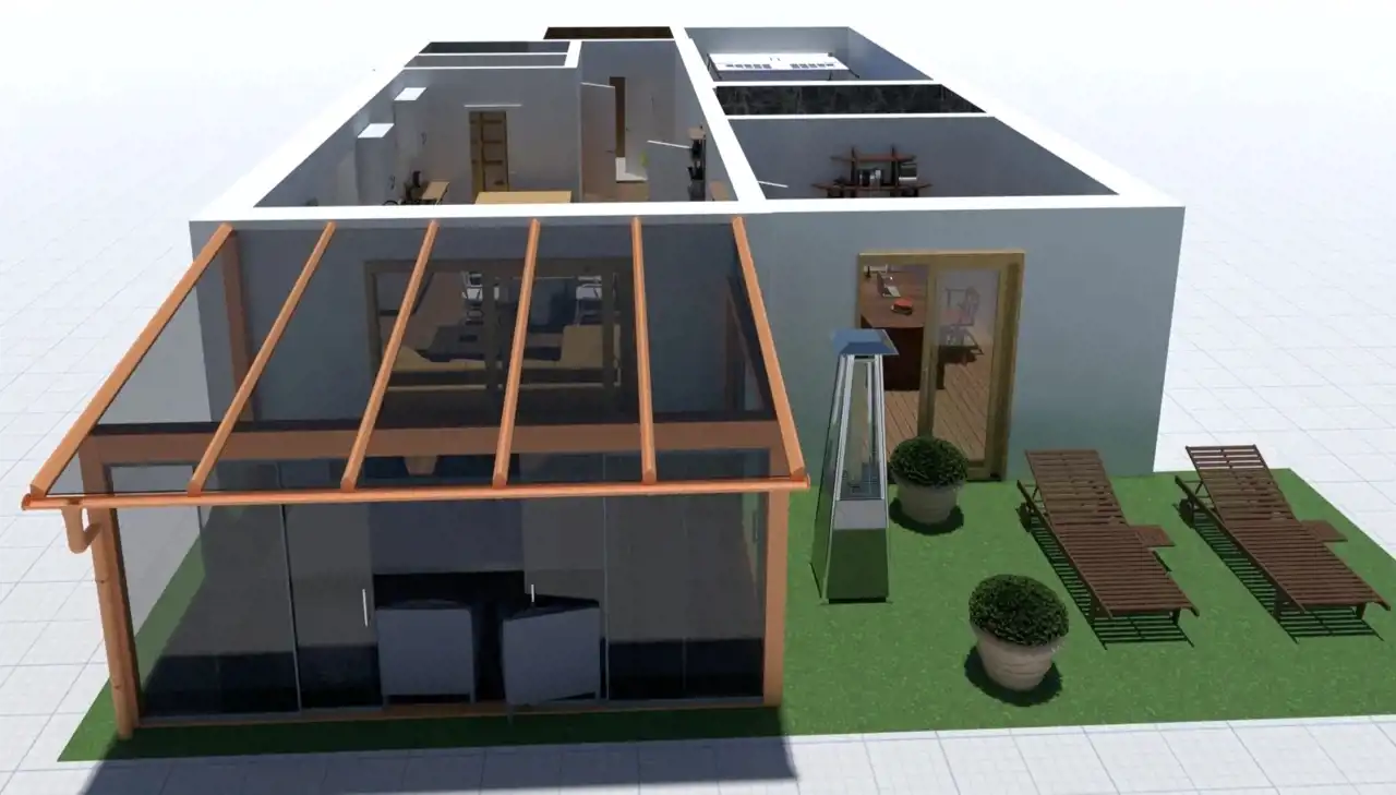 Dom jest dwupoziomowy o bardzo dobrze zaplanowanym rozkładzie pomieszczeń, który zapewnia wyraźny podział na strefę dzienną i prywatną. Dzięki dużym przeszkleniom dom jest jasny i dobrze doświetlony.