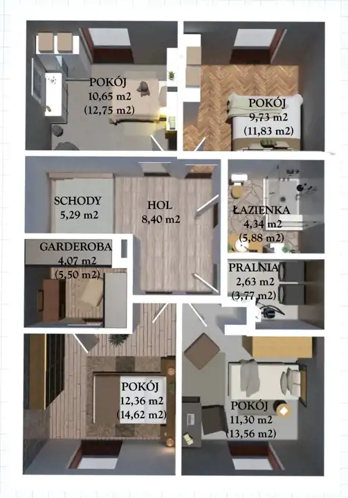 - pokój 4 – 12,36 m² pow. użytkowej (14,62 m² pow. podłóg)