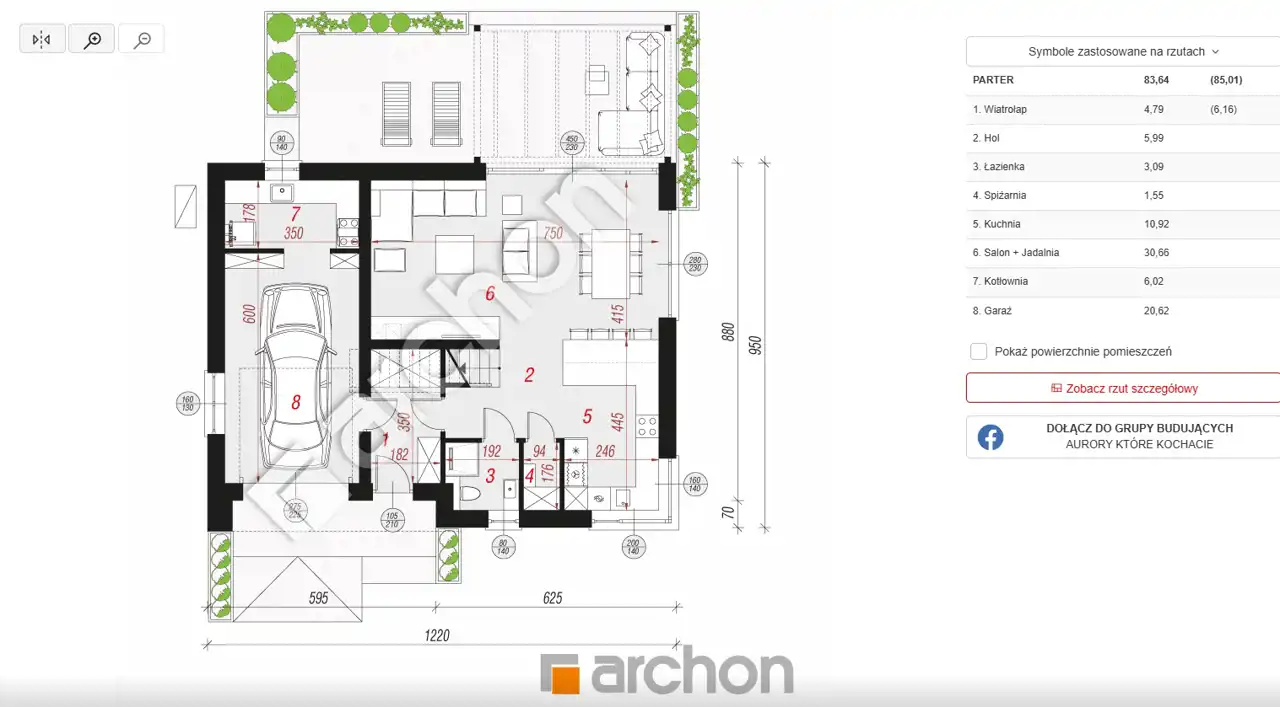 Parter (83,64m2): wiatrołap (4,79m2), hol (5,99m2), salon z jadalnią (30,66m2), łazienka (3,09m2), kuchnia (10,92m2), spiżarnia (1,55m2), kotłownia (6,02m2), garaż (20,62m2)