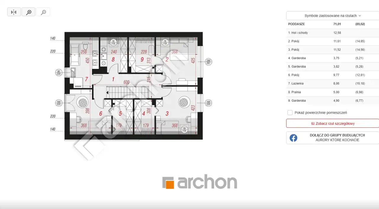 Poddasze (71,01m2): hol + schody (12,58m2), pokój (11,61m2), pokój (11,52m2), garderoba (3,75m2), garderoba (3,82m2), pokój (9,77m2), łazienka (8,06m2), pralnia (5,0m2), garderoba (4,90m2).