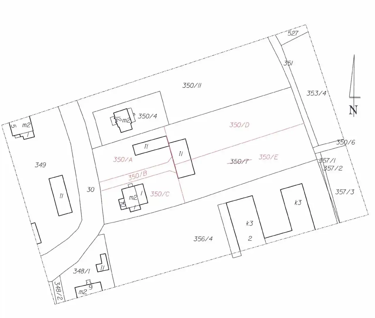 Układ działki oraz jej cechy fizyczne pozwalają na wydzielenie np. kilku działek oraz drogi wewnętrznej. Wśród załączonych zdjęć jest wstępny projekt podziału na następujące działki: