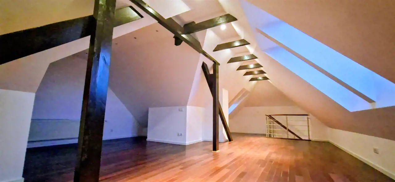 Bardzo ładnie zaaranżowany strych po całej długości domu, z wyeksponowanymi belkami (bejcowane na ciemny kolor w jasnym pomieszczeniu robi wrażenie elegancji i przytulności ), przestrzeń gotowa do zagospodarowania.