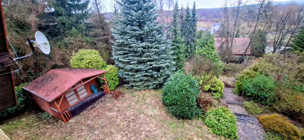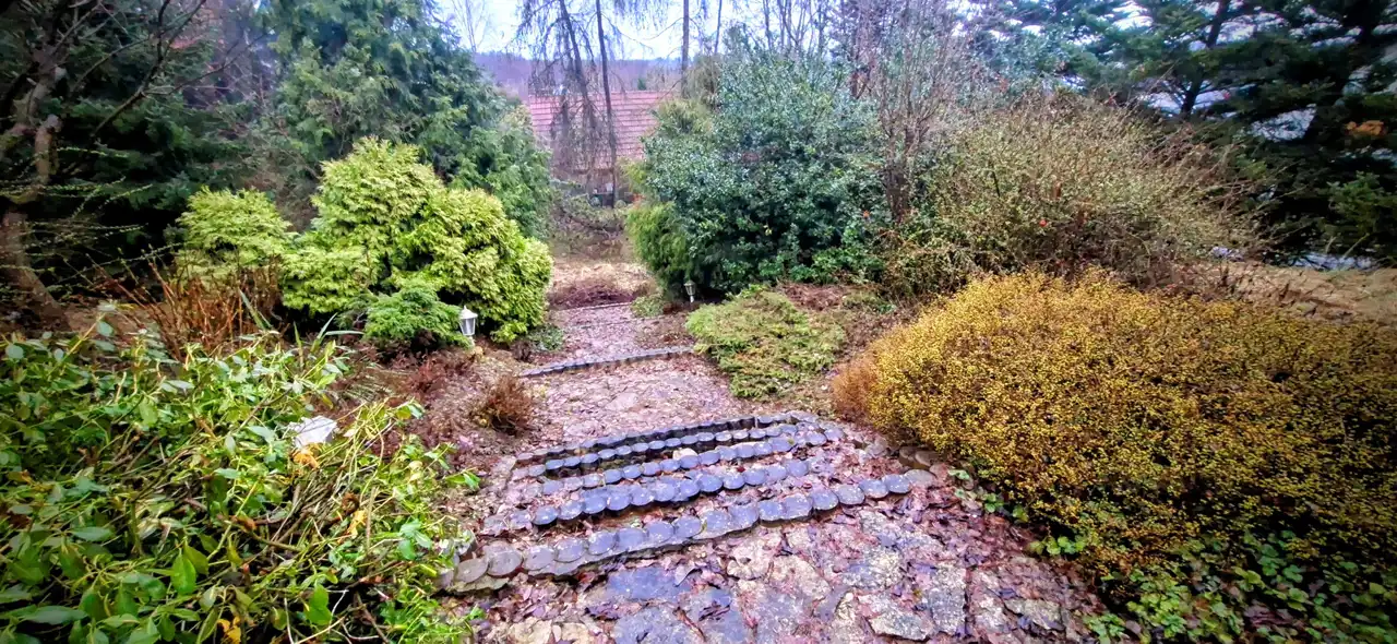 - Działka Zagospodarowana, lekko nachylona, prostokąt