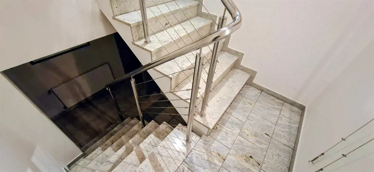 Duże przeszklenia wejścia i okien, otwarte przestrzenie, wysoka jakość materiałów do wykończenia – podłogi z drewna, schody granitowe, balustrady szklane, wewnętrzny kominek.