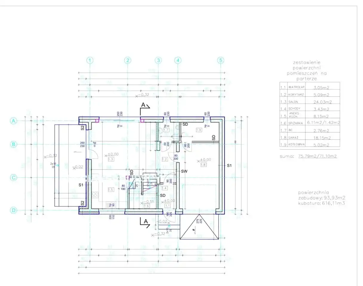Parter (71,10m2): wiatrołap (3,05m2), korytarz (5,09m2), salon (24,03m2), schody (3,43m2), aneks kuchenny (8,15m2), spiżarka (1,42m2), wc (2,76m2), garaż (18,15m2), kotłownia (5,02m2).