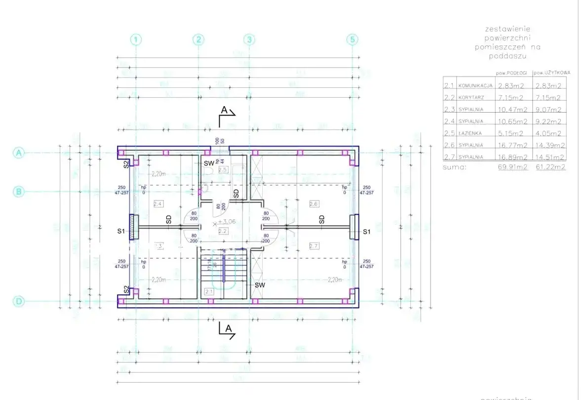 Poddasze (61,22m2): komunikacja (2,83m2), korytarz (7,15m2), pokój (9,07m2), pokój (9,22m2), łazienka (4,05m2), pokój (14,39m2), pokój (14,51m2).