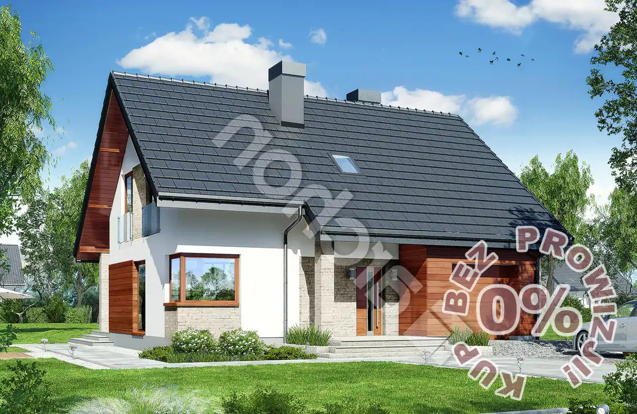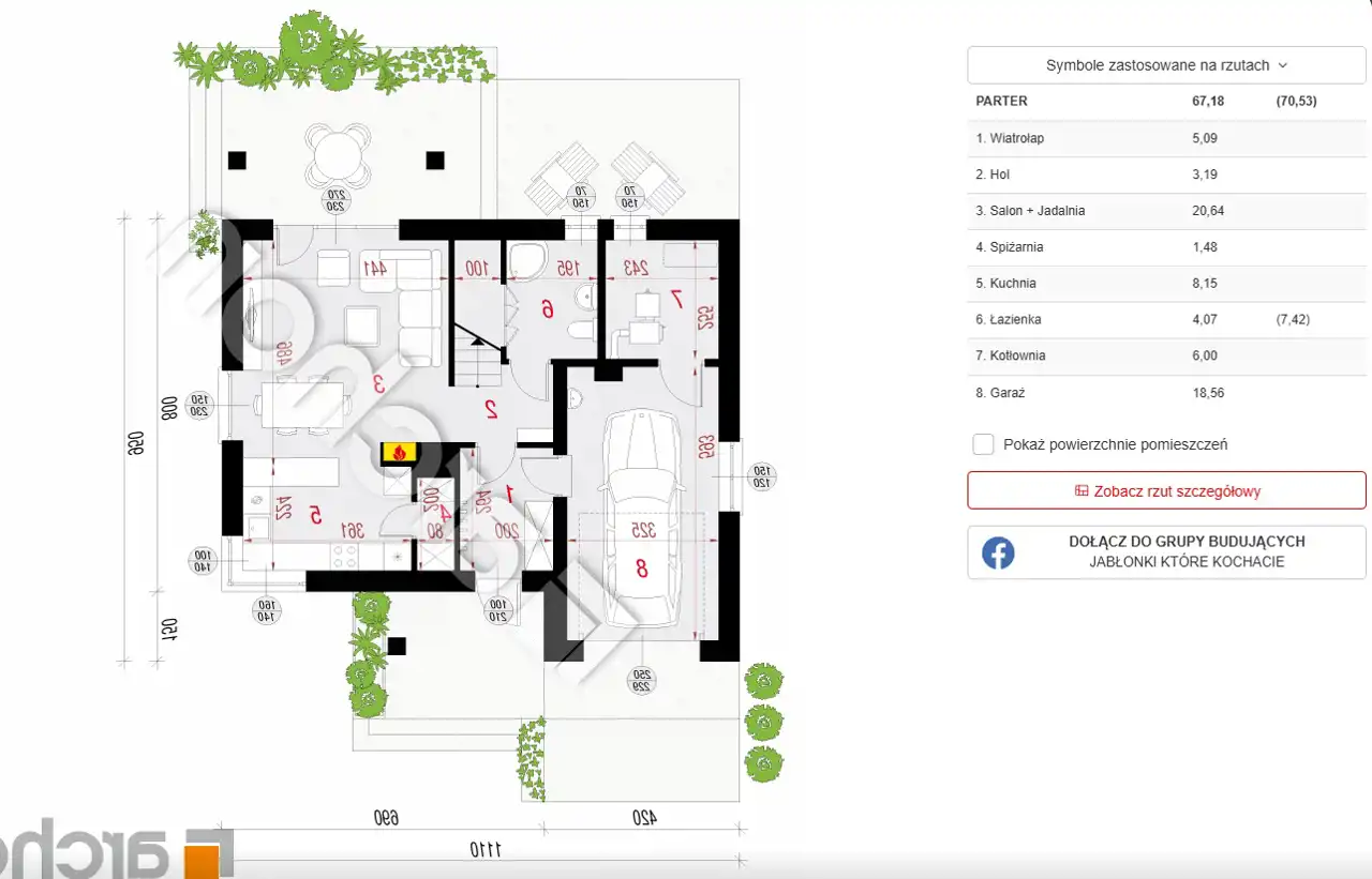 Parter: wiatrołap (5,09m2), salon + jadalnia (20,64m2), spiżarnia (1,48m2), kuchnia (8,15m2), hol (3,19m2), łazienka (4,07m2), kotłownia (6m2), garaż (18,56m2).