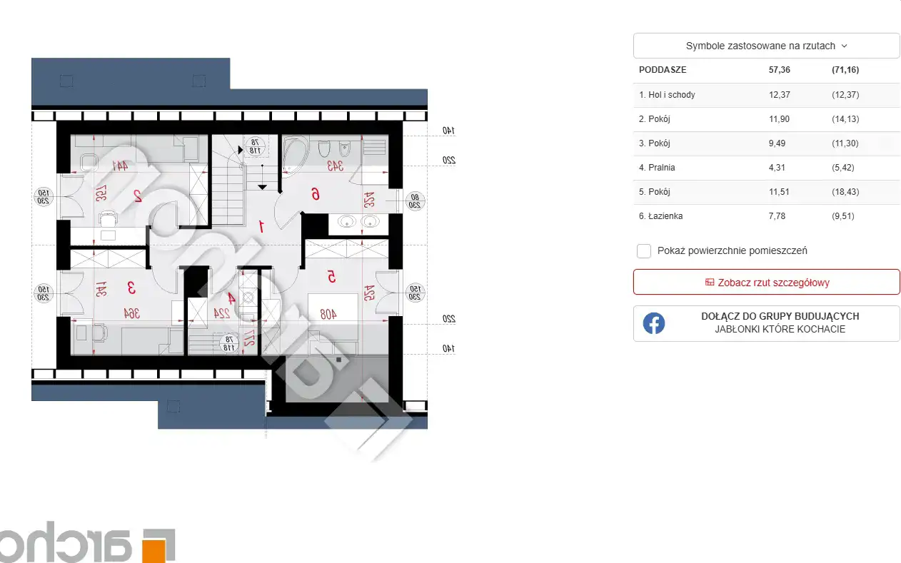 Poddasze: hol +schody (12,37m2), pokój (11,90m2), pokój (9,49m2), pralnia (4,31m2), łazienka (7,78m2), pokój (11,51m2).