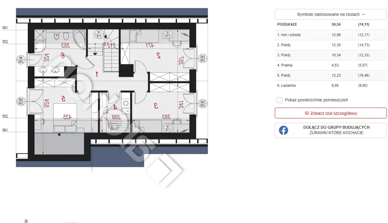Poddasze: hol +schody (12,06m2), pokój (12,35m2), pokój (9,34m2), pralnia (4,53m2), łazienka (8,05m2), pokój (12,23m2)
