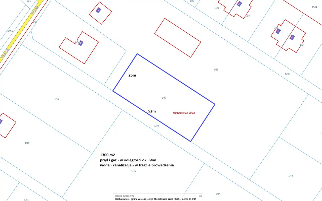 - Media Woda: w trakcie prowadzenia; Kanalizacja: w trakcie prowadzenia; Prąd: w ulicy; Gaz: w ulicy