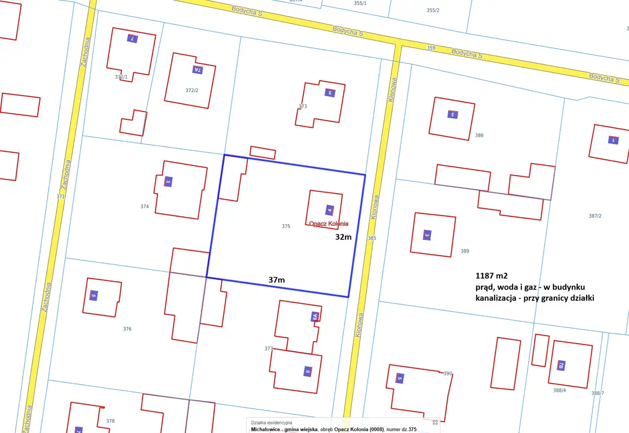 - Media Woda: na działce; Kanalizacja: w ulicy; Prąd: na działce; Gaz: na działce