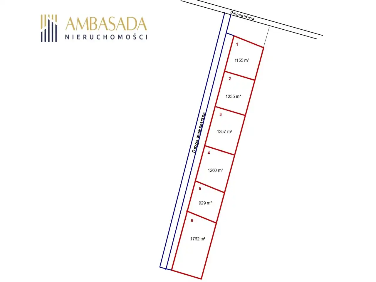 Oferta obejmuje 6 sąsiadujących ze sobą działek w cenie 150 zł/m2, wynikających z podziału obszaru o nr geod. 196 o łącznej powierzchni 1,37 ha tj.: