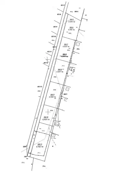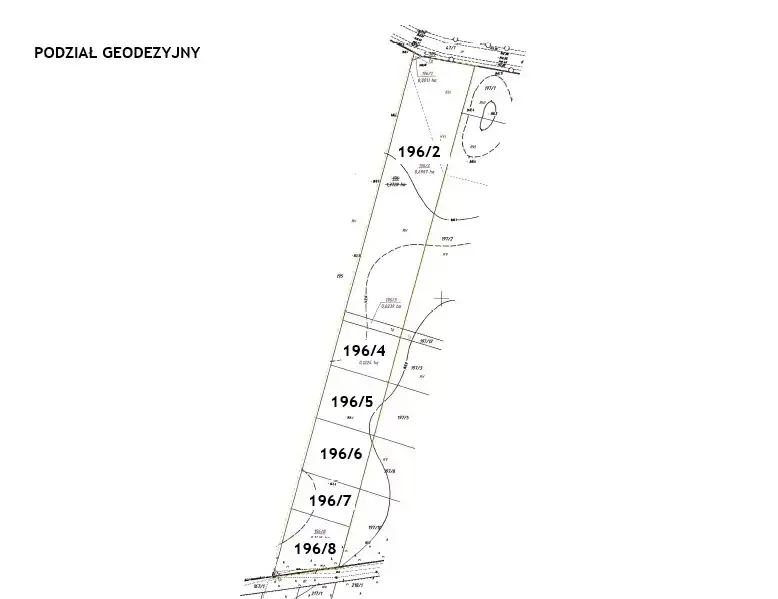 Działki w kształcie prostokąta zalesione, z dojazdem wytyczonym w drodze wewnętrznej (196/1 i 196/3). Klasa gruntu RV i RVI. Media: prąd w drodze dojazdowej przy działce nr 196/8.