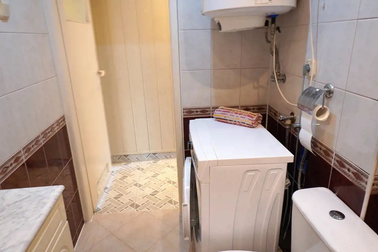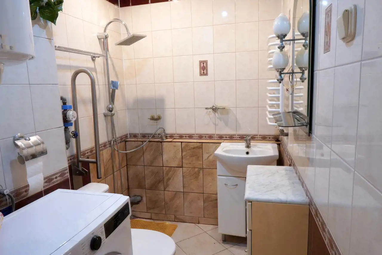 - Łazienka z WC w której znajduje się prysznic, szafka, umywalka oraz pralka;