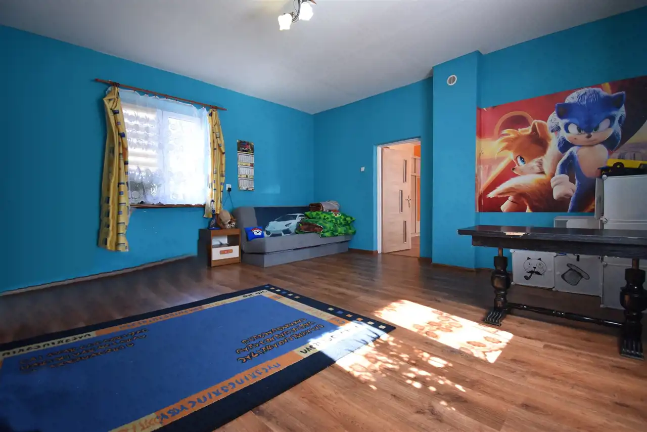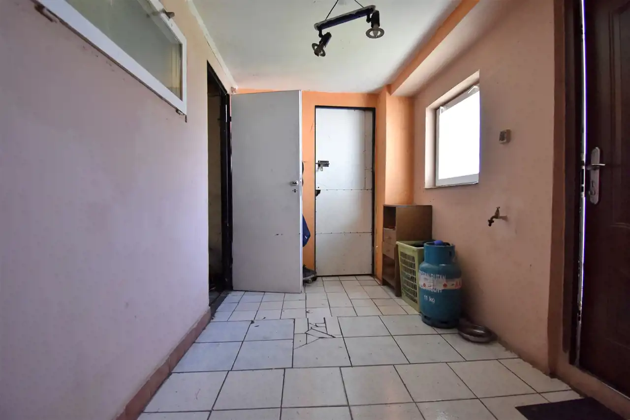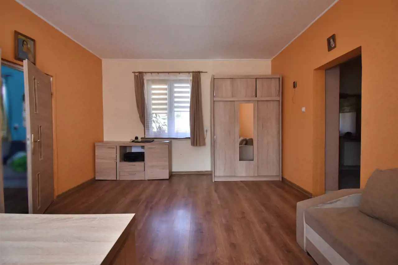 The house was built of brick, insulated from the inside with styrofoam and on the outside with mineral wool, finished with lime plaster, mesh, and textured coating. The roof is covered with metal sheets, half of which has been painted. PVC windows, heating with a solid fuel stove; in summer, water is heated with a Junkers gas heater connected to a gas bottle. Access via an asphalt road.