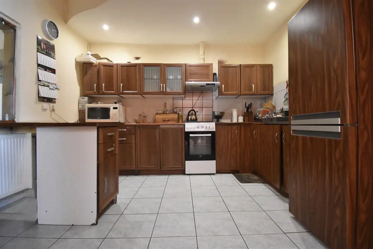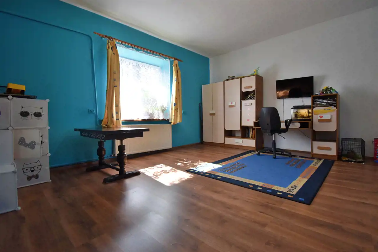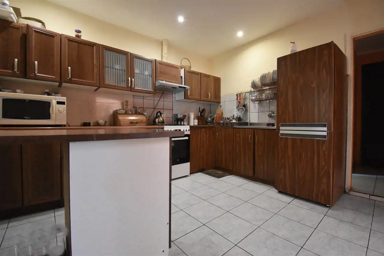 The house was built of brick, insulated from the inside with styrofoam and on the outside with mineral wool, finished with lime plaster, mesh, and textured coating. The roof is covered with metal sheets, half of which has been painted. PVC windows, heating with a solid fuel stove; in summer, water is heated with a Junkers gas heater connected to a gas bottle. Access via an asphalt road.
