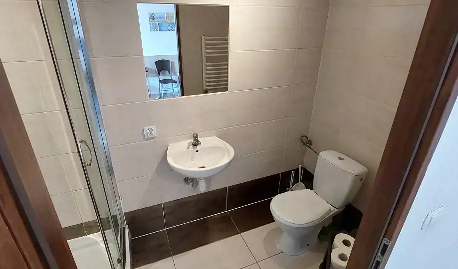 Podłogi są w korytarzach, kuchni i łazienka z terakoty, w pokojach z paneli. Pokoje wyposażone w łóżka, szafy, TV. W łazienkach kabiny natryskowe, umywalki, sedesy, lustra. Wyposażenie przygotowane pod wynajem dla wczasowiczów lub wynajmy długookresowe.