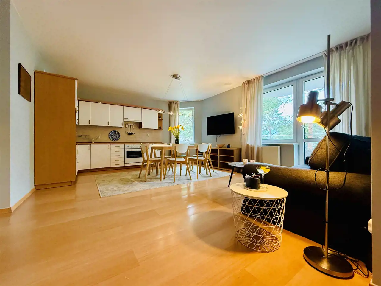 Przestronny salon z aneksem kuchennym i wyjściem na balkon,