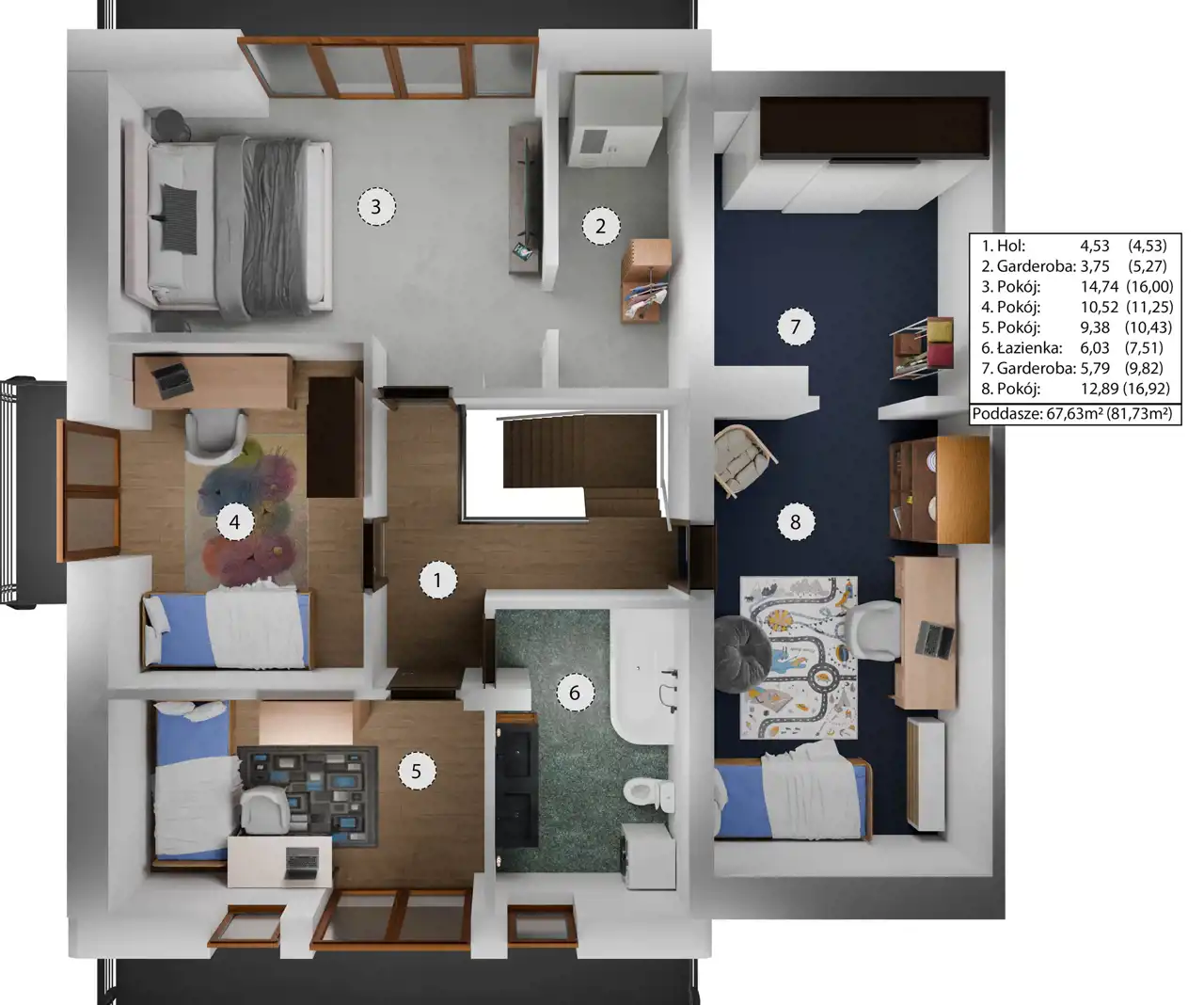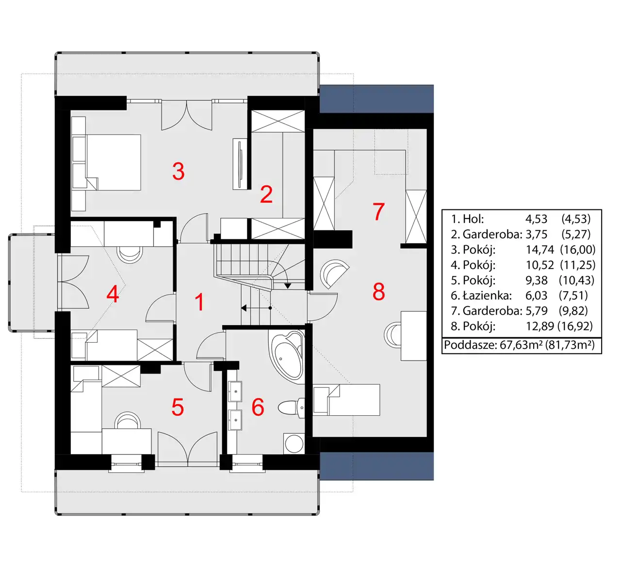 - Funkcjonalny układ pomieszczeń – z czterema sypialniami, dwoma łazienkami.