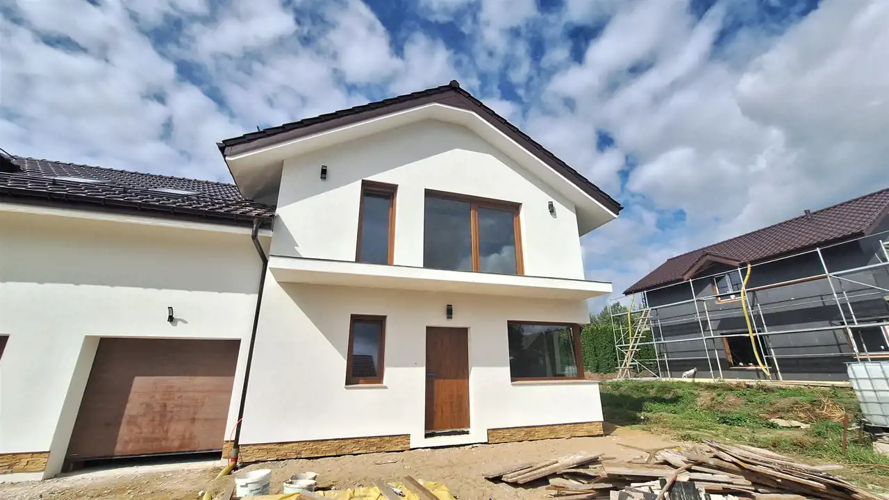- Elewacja wykończona w dekoracyjnym tynku silikonowym oraz częściowo w kamieniu elewacyjnym.