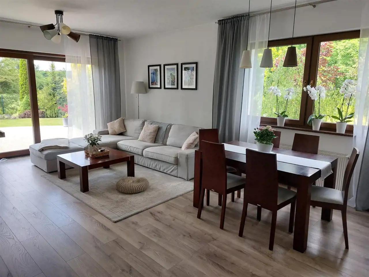 Dom otacza urokliwy, zadbany ogród — stanowiący prywatny świat zieleni, idealny do relaksu, spotkań z rodziną czy przyjęć na świeżym powietrzu. Z ogrodu roztacza się piękny widok, a przestrzeń pozwala na dowolną aranżację.