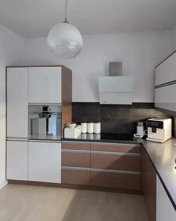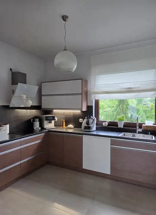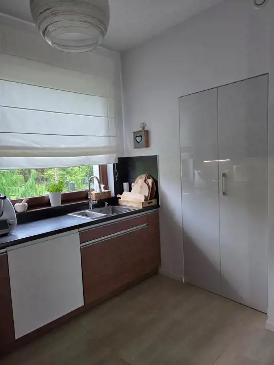 - Jasna kuchnia (9,82 m²) z pełnym wyposażeniem AGD oraz praktyczną spiżarnią (2,24 m²)