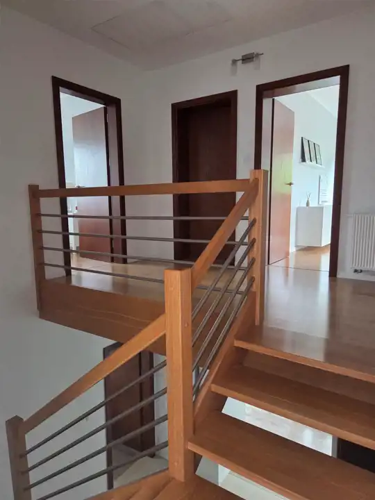 Wnętrza wykończone ze smakiem i dbałością o detale: drewniane schody i stolarka drzwiowa, gładzie na ścianach, rolety elektryczne, okna PCV z okuciami antywłamaniowymi, system alarmowy i nowoczesne oświetlenie.