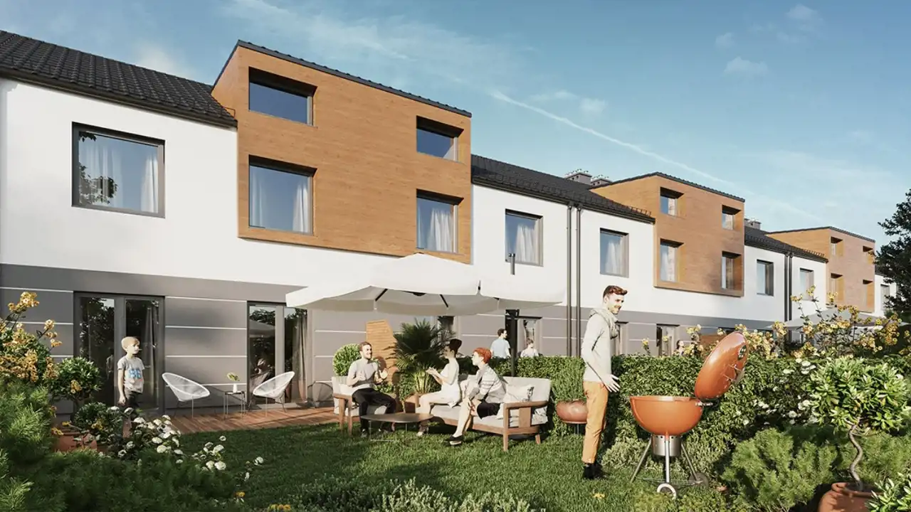 DOMY JEDNORODZINNE W ZABUDOWIE SZEREGOWEJ, POŁOŻONE NA ZACHODNICH PRZEDMIEŚCIACH WROCŁAWIA W WILKSZYNIE, W BLISKIIM SĄSIEDZTWIE LASU MOKRZAŃSKIEGO