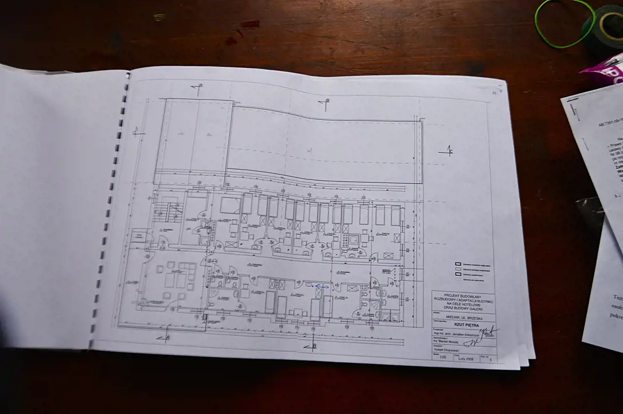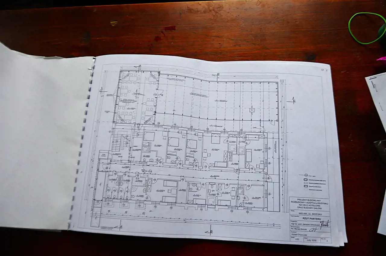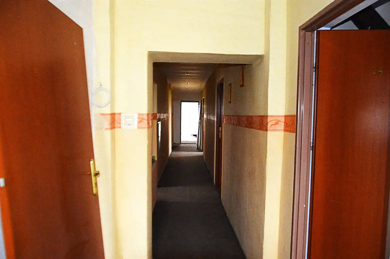 - Układ pomieszczeń: 26 pokoi (w większości 2 osobowych), każdy z własną łazienką.