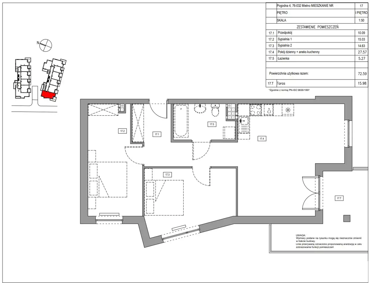 Mieszkanie o powierzchni 72,59 m2 składa się z: