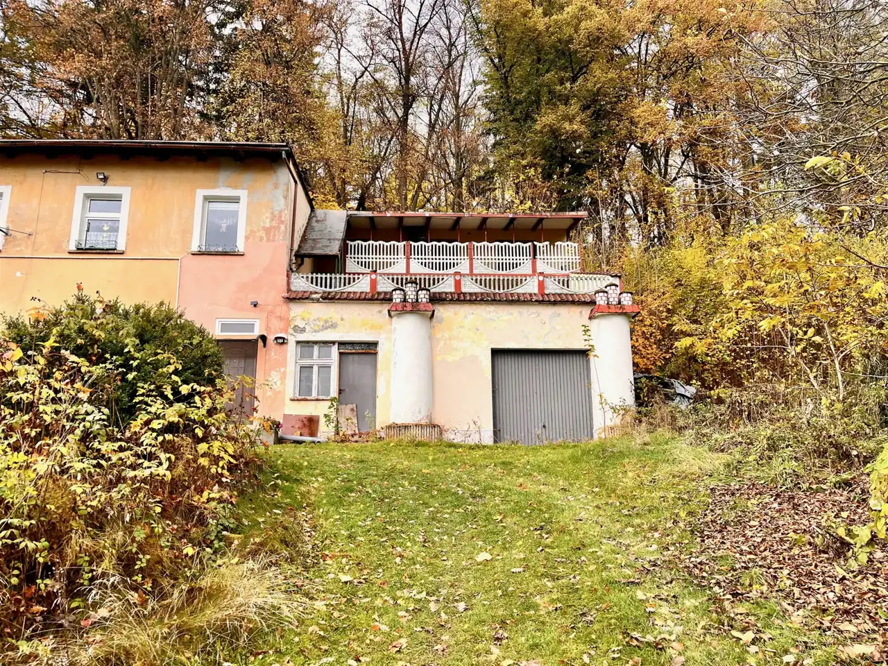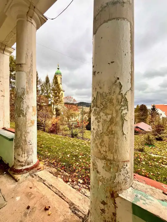 Elewacja wymaga odnowienia. Wejście do domu prowadzi przez portyk zwieńczony trójkątnym frontonem wzorowany na świątyniach greckich. Zadaszony ganek z ozdobnymi kolumnami składającymi się z podstawy, trzonu i głowicy pełni funkcję ochronną i ozdobną zarazem. Jest to architektoniczne rozwiązanie, które dodaje obiektowi stylu klasycznego dworku. Wokół nieruchomości jest spory teren współdzielony z sąsiadem z wyznaczeniem obszaru przynależnego do każdego z mieszkań. Część terenu stanowi porośnięta samosiejkami skarpa.