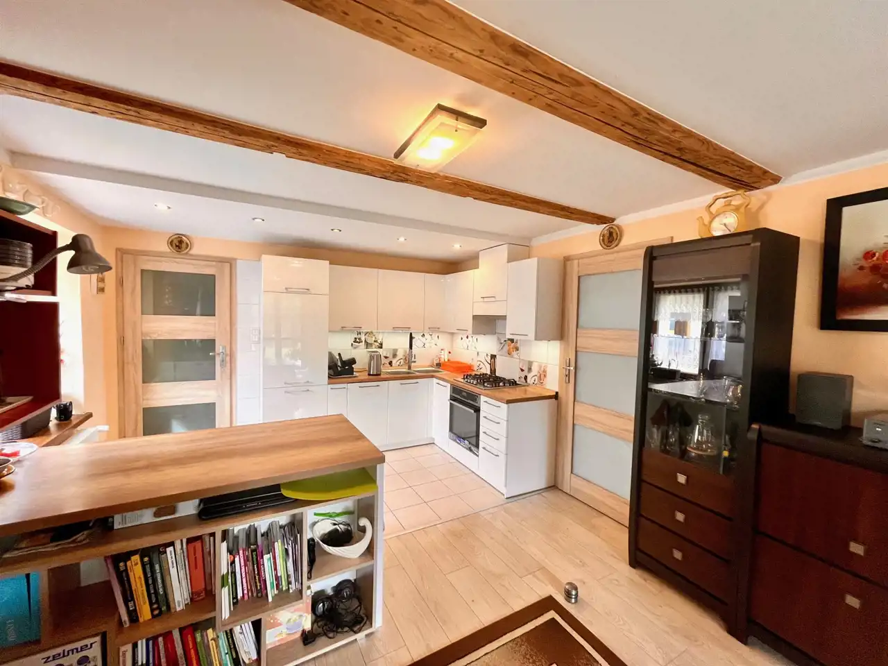 Stolarka PCV, na podłogach panele i gres W łazience glazura i terakota, na ścianach gładzie. Całość wykończona w stylu sielskim. Uroku dodają elementy drewniane, i nieco niższe stropy na parterze. Z salonu połączonego z kuchnią prowadzi wyjście na wyłożony mrozoodpornym gresem, zadaszony taras z południową ekspozycją słońca. Nad tarasem mieści się duży balkon z wejściem do dwóch osobnych pokoi. Pomieszczenia i woda ogrzewane są ekonomicznym i ekologicznym, nowym, z automatycznym podajnikiem, piecem na eko groszek. Woda z własnej studni. Istnieje możliwość przyłączenia do sieci wodnej. Kanalizacja podpięta do ekologicznej przydomowej oczyszczalni ścieków. Dom generuje bardzo niskie koszty utrzymania. Nieruchomość z 1930 roku, wzniesiona w technologii tradycyjnej, mieszanej, parterowa z poddaszem mieszkalnym i drugim poziomem poddasza - strychem nieużytkowym, oraz częściowo podpiwniczona. Ściany murowane na zaprawie cementowo wapiennej. Stropy ceramiczne i drewniane, schody wewnętrzne drewniane, dach konstrukcji drewnianej, spadzisty, kryty dachówką. Posesja ogrodzona. Z jednej strony ograniczona rzeką Ścinawką.