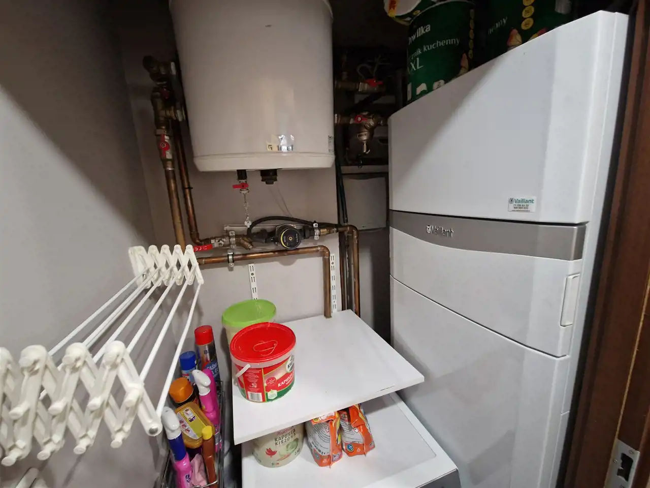 Mieszkanie bardzo słoneczne i ciepłe dzięki nowoczesnej pompie ciepła marki Vaillant, co gwarantuje niskie koszty utrzymania w okresie zimowym i zapewnia komfort w chłodniejsze dni.