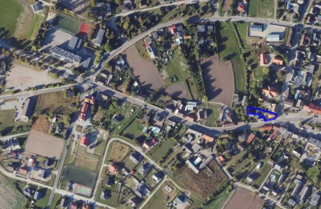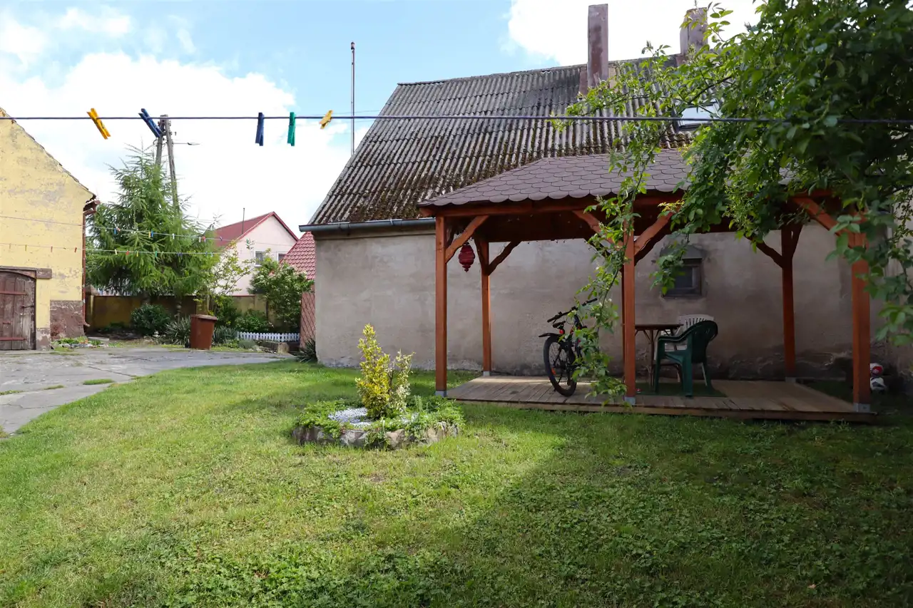 Nieruchomość zabudowana jest budynkiem mieszkalnym z częścią użytkową oraz zabudową gospodarczą.