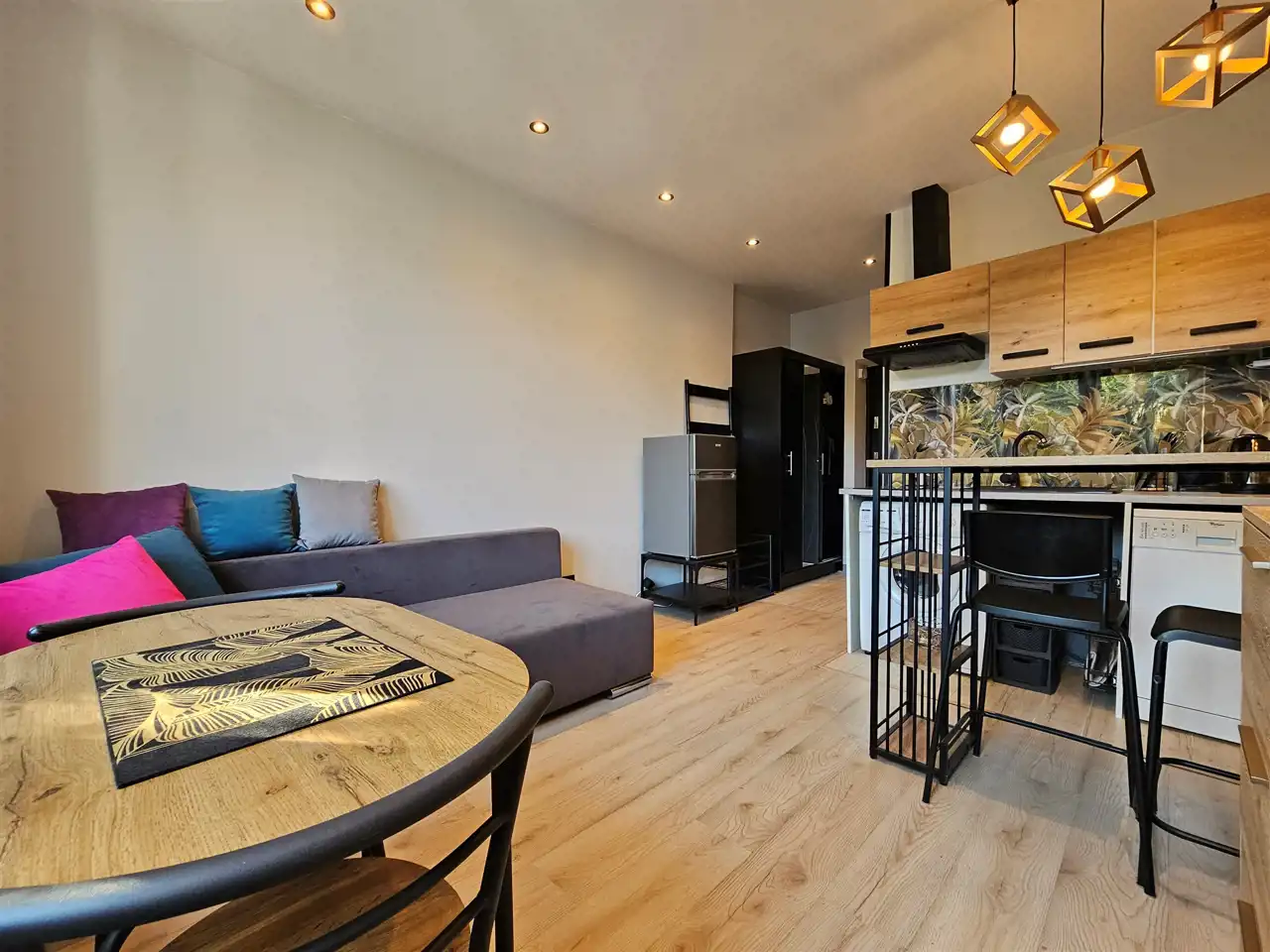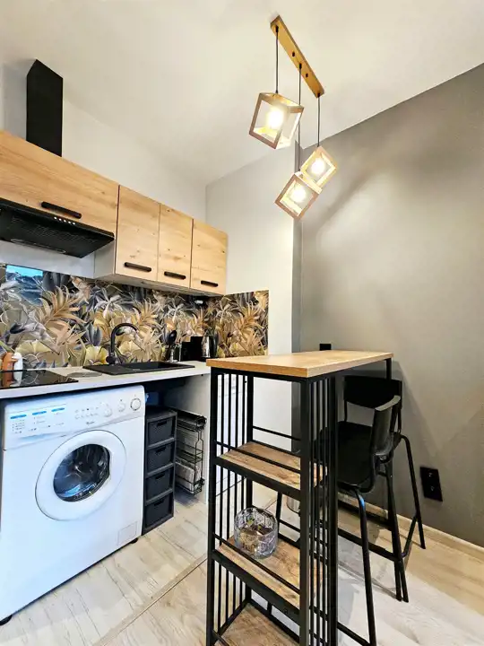Pokój w pełni umeblowany : rozkładana sofa, stół, komoda, kuchnia w pełni wyposażona ( w zabudowie): płyta grzewcza elektryczna, zmywarka, lodówka, pakowne szafki.