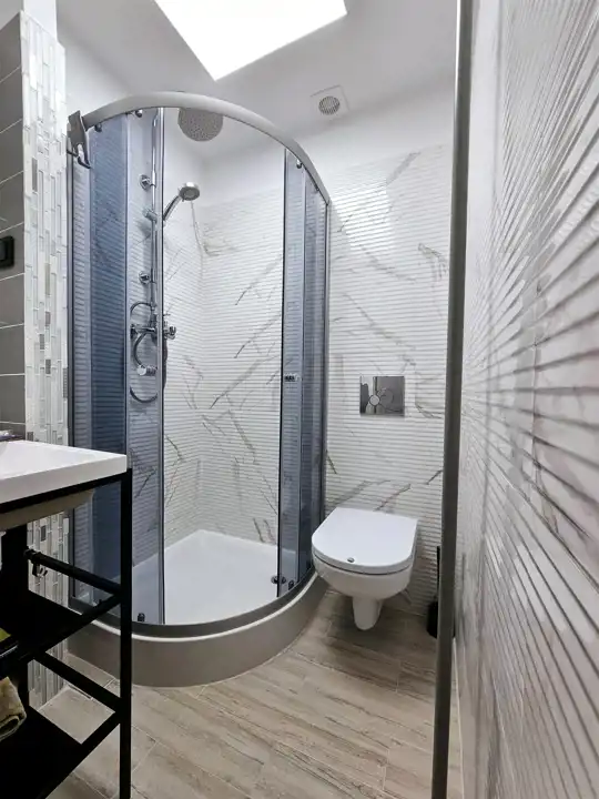 Łazienka z kabiną prysznicową oraz pralka. W przedpokoju pakowna szafa.