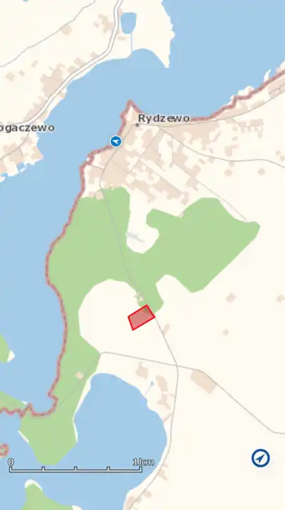 Działka znajduje się w wytyczonym kompleksie 6 działek budowlanych, na ulicy Mazurskiej, przy drodze asfaltowej prowadzącej do Rydzewa, w pobliżu jeziora Bocznego.