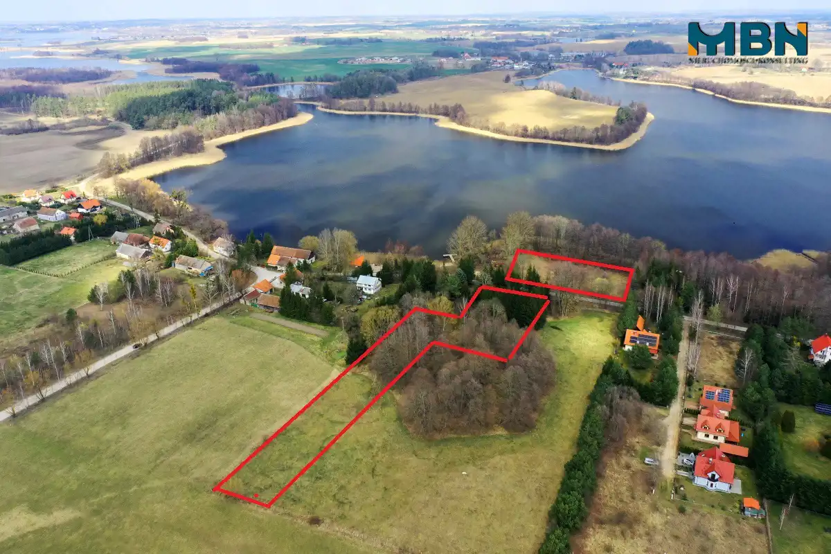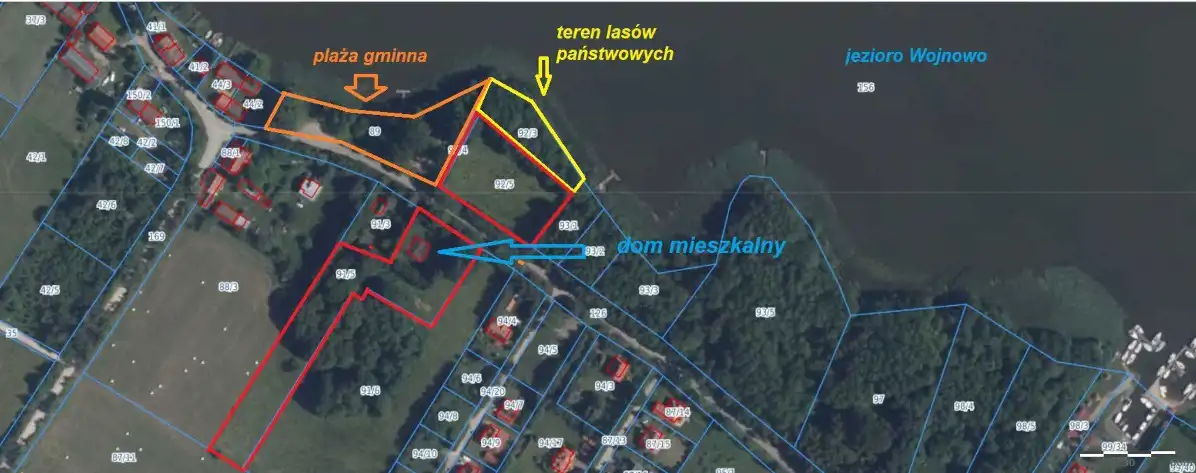 oraz działka naprzeciwko domu o pow. 3424 m2 znajdująca się 20m w linii prostej od brzegu jeziora Wojnowo.