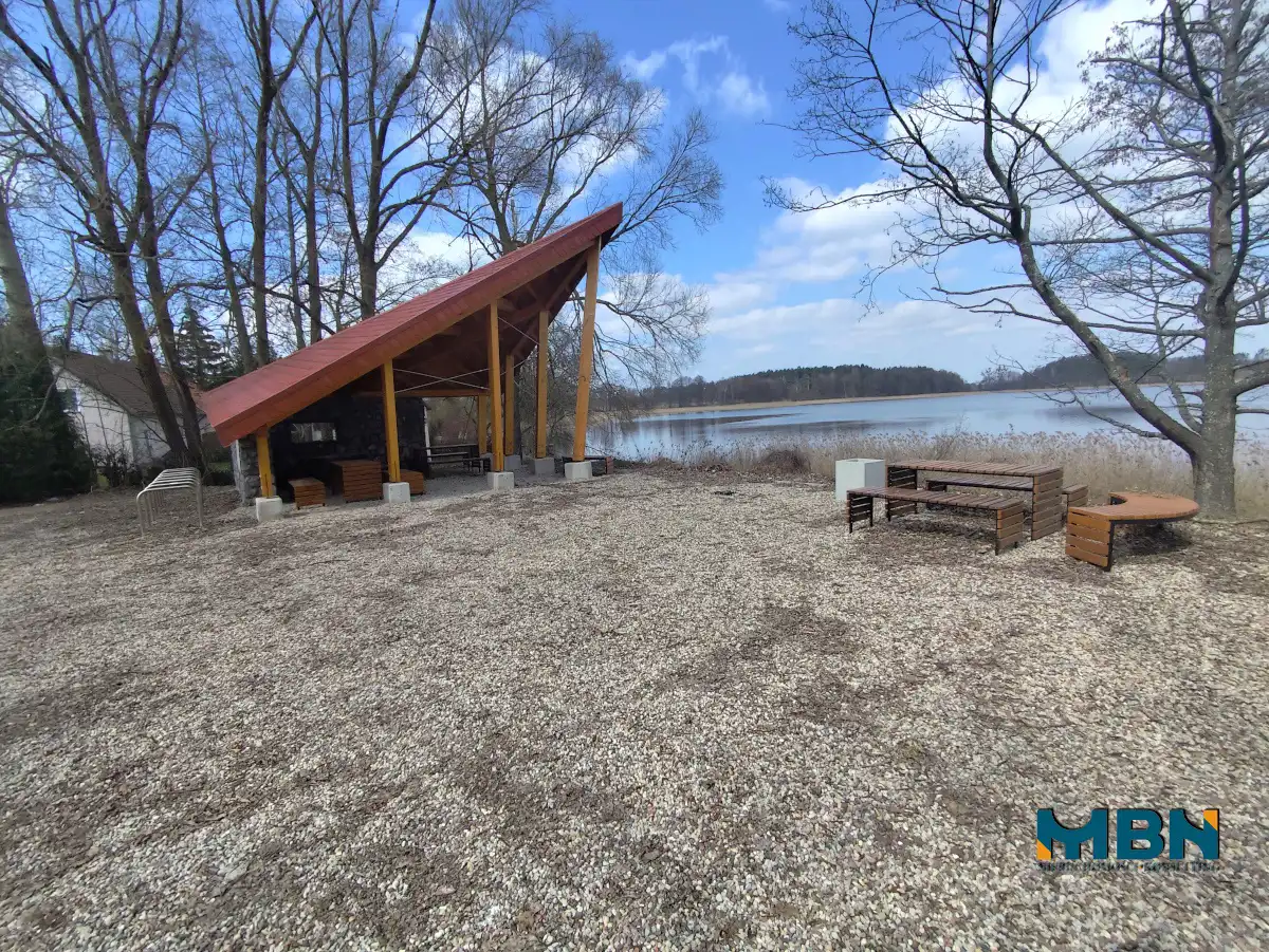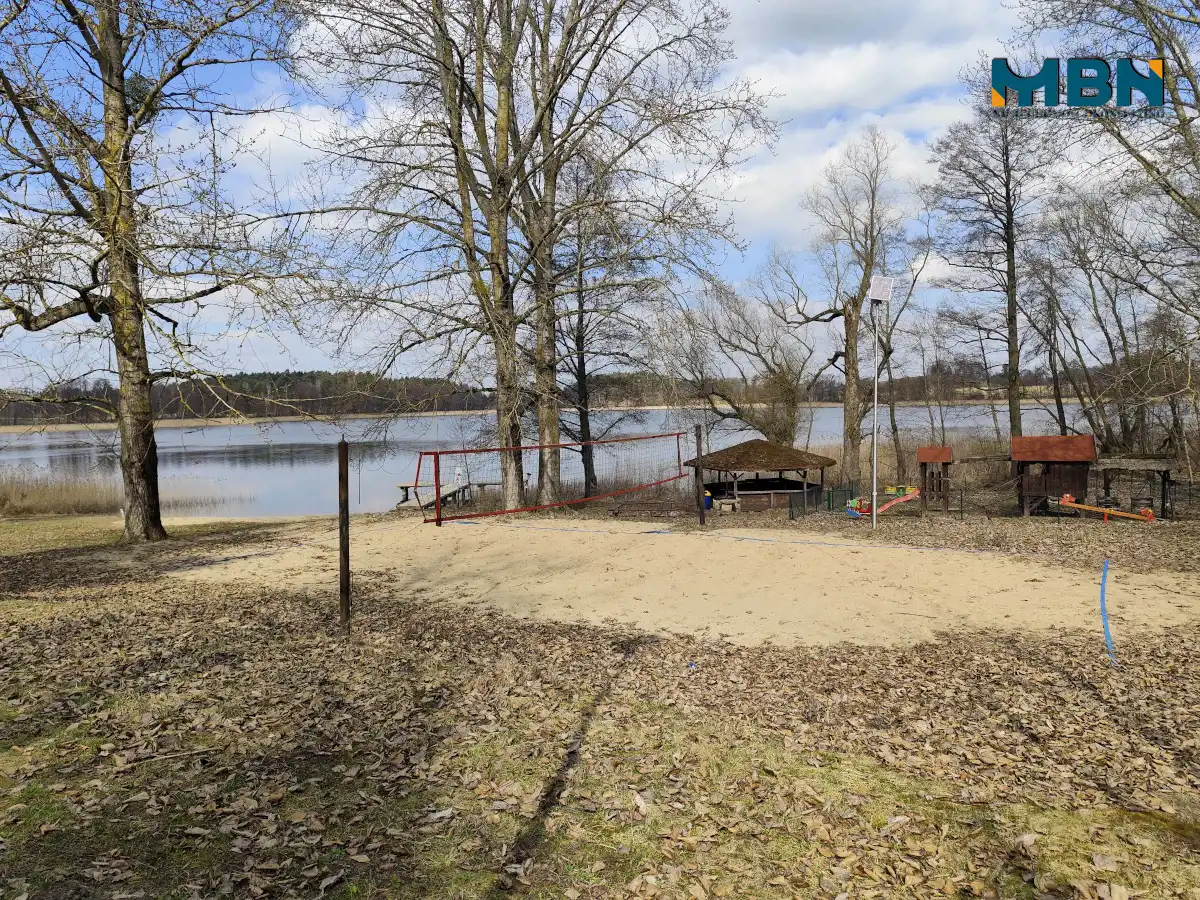 - obok znajduje się działka należącą go Gminy Miłki (z linią brzegową) gdzie urządzona jest plaża oraz wiata rowerowa;