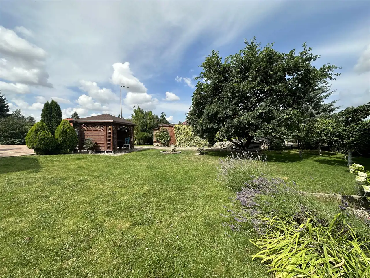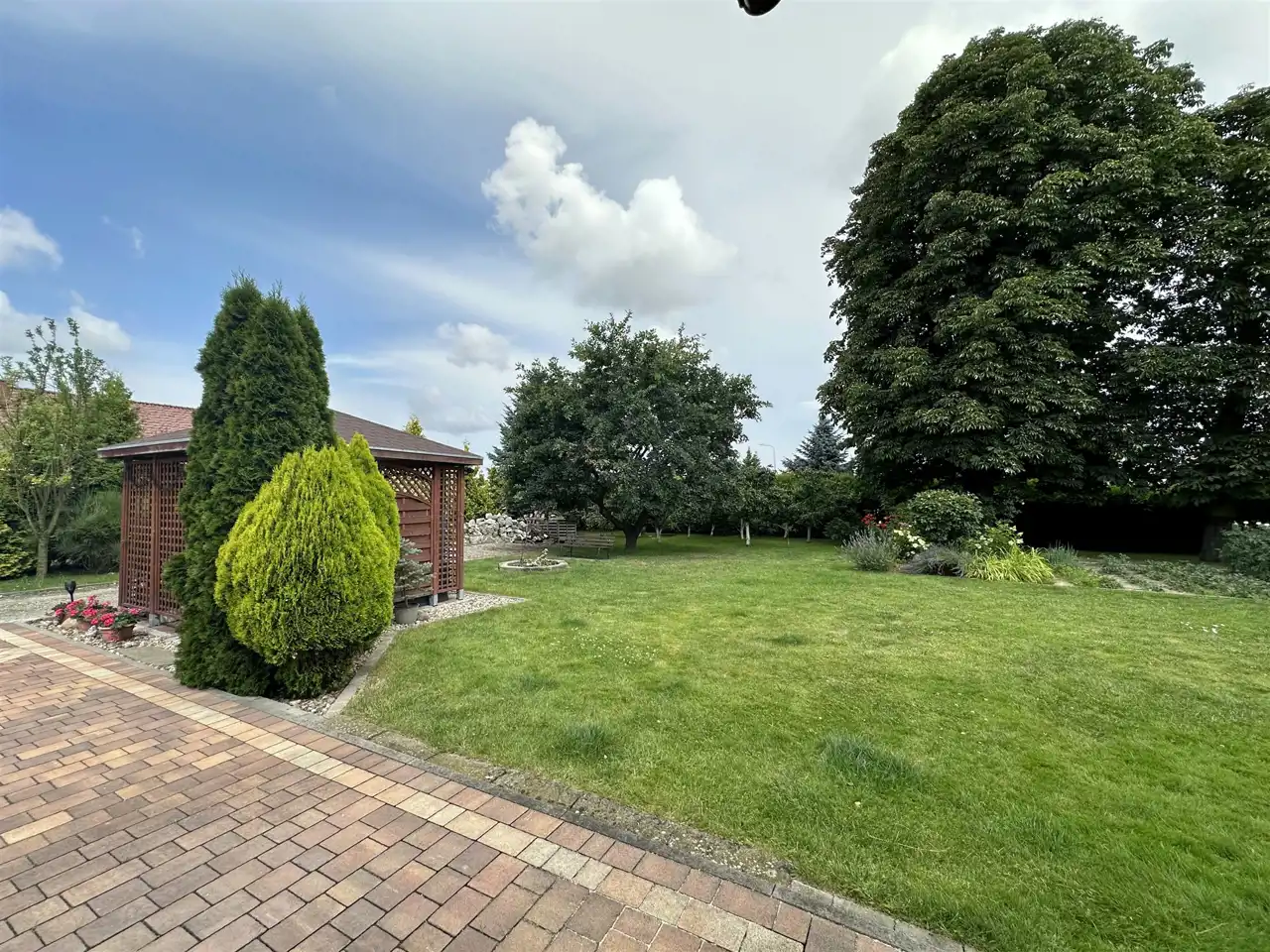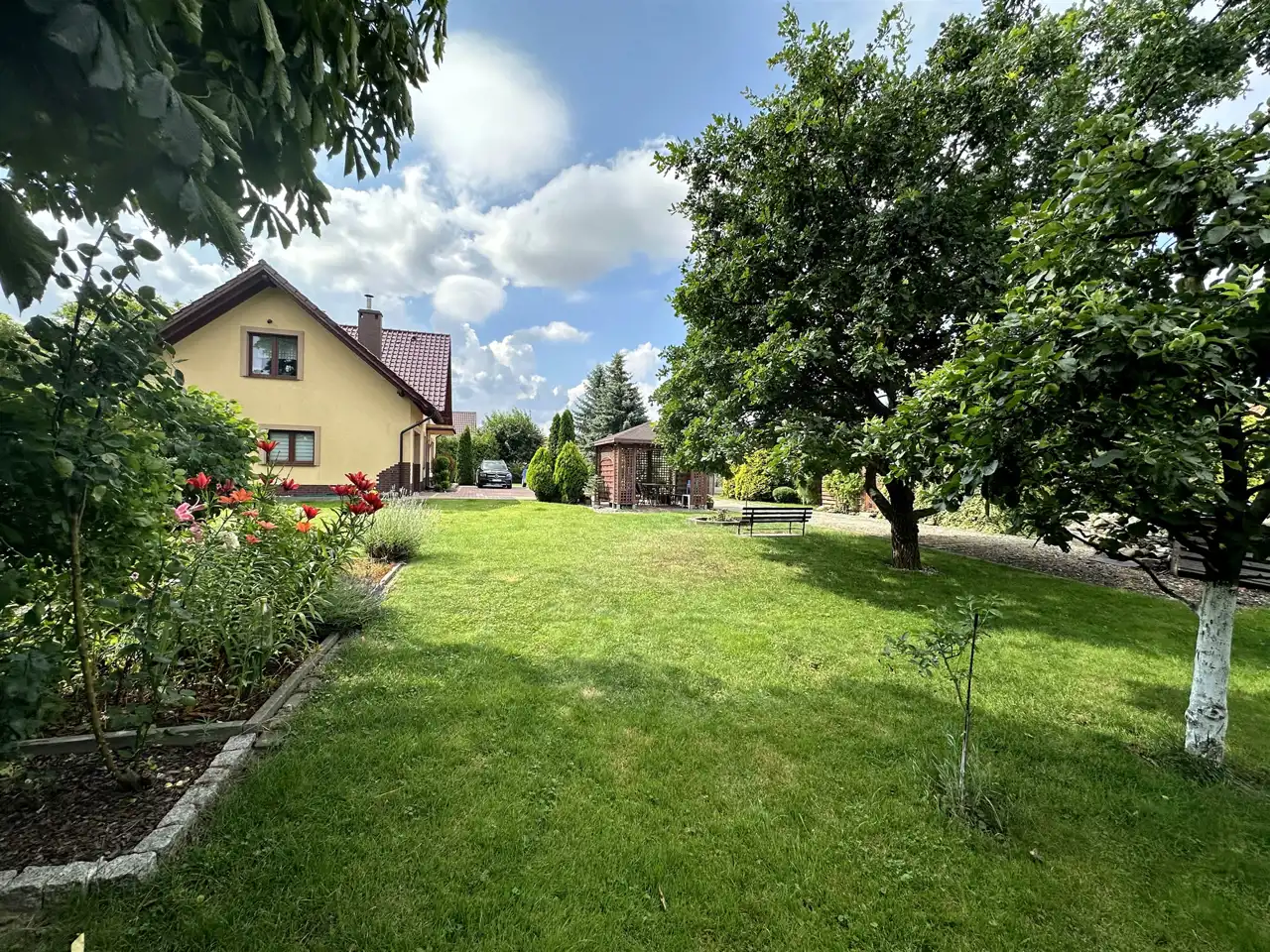 Dużym atutem nieruchomości jest przestronny ogród z dużą ilością nasadzeń w tym drzewa choinkowe, owocowe, krzewy, kwiaty, warzywa. Taras, miejsce na ognisko, wiata ogrodowa zachęcają do spędzania czasu na świeżym powietrzu. Dodatkowo do przechowywania sprzętu ogrodowego służy drewutnia (ok. 15 m2).
