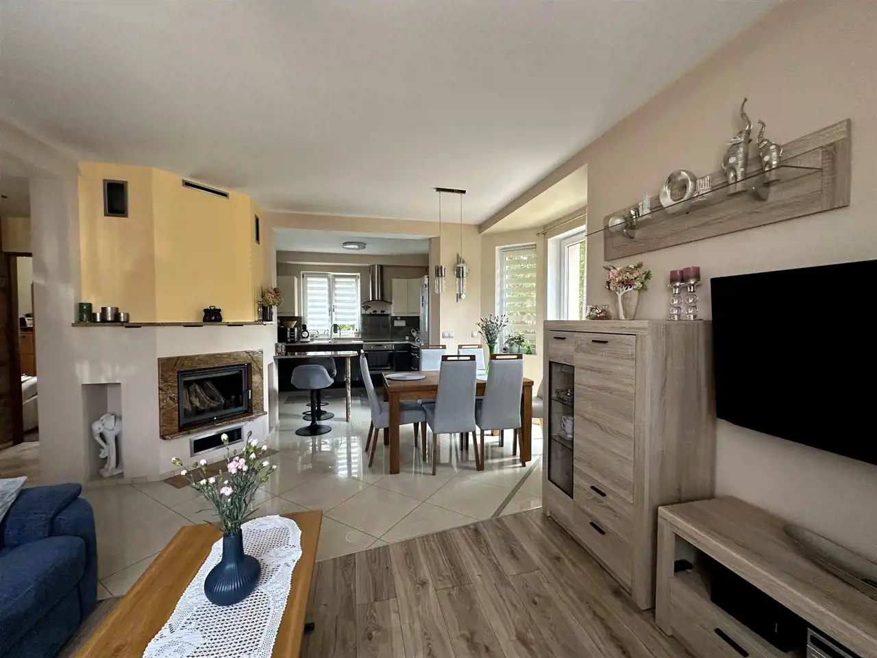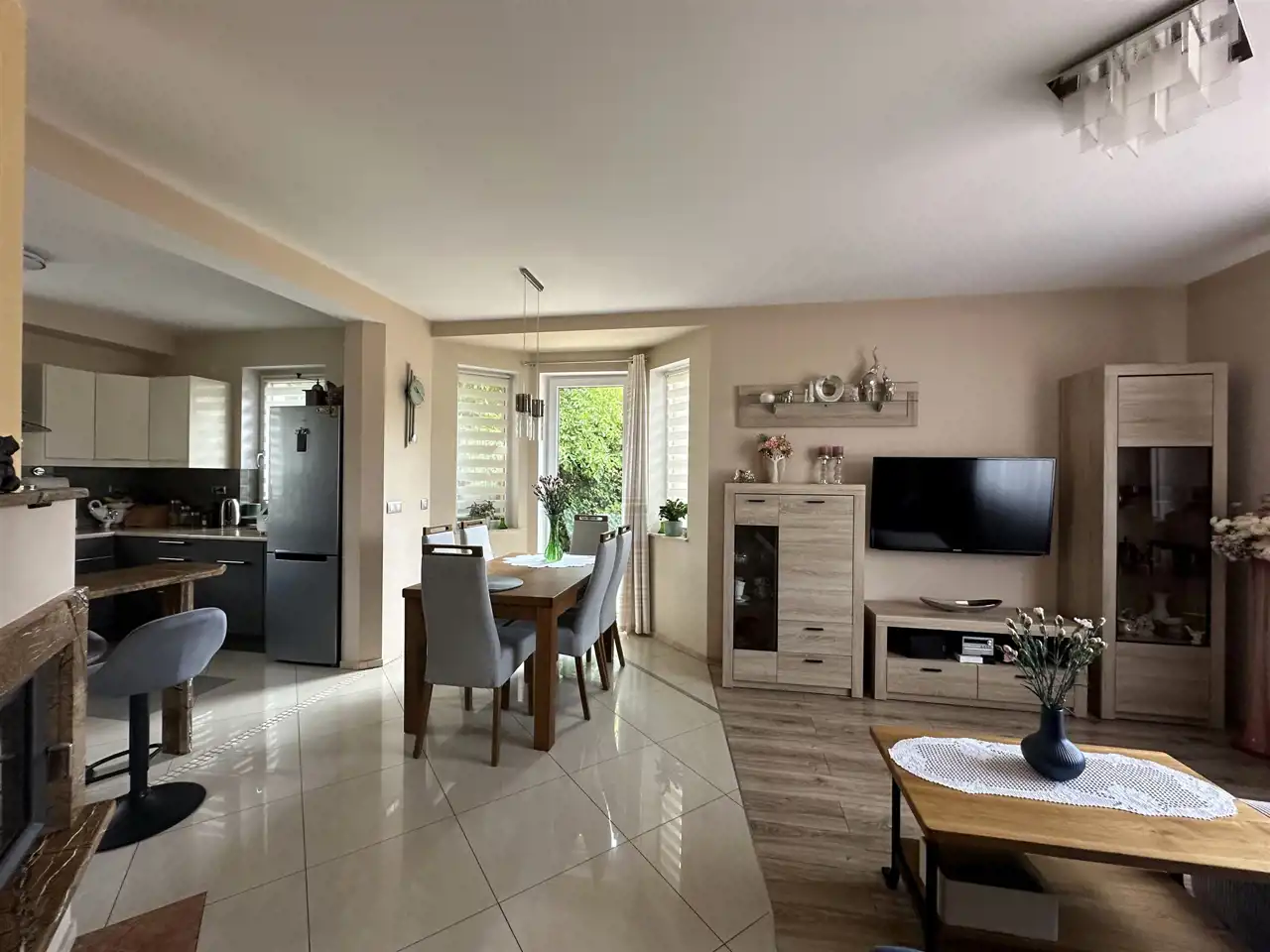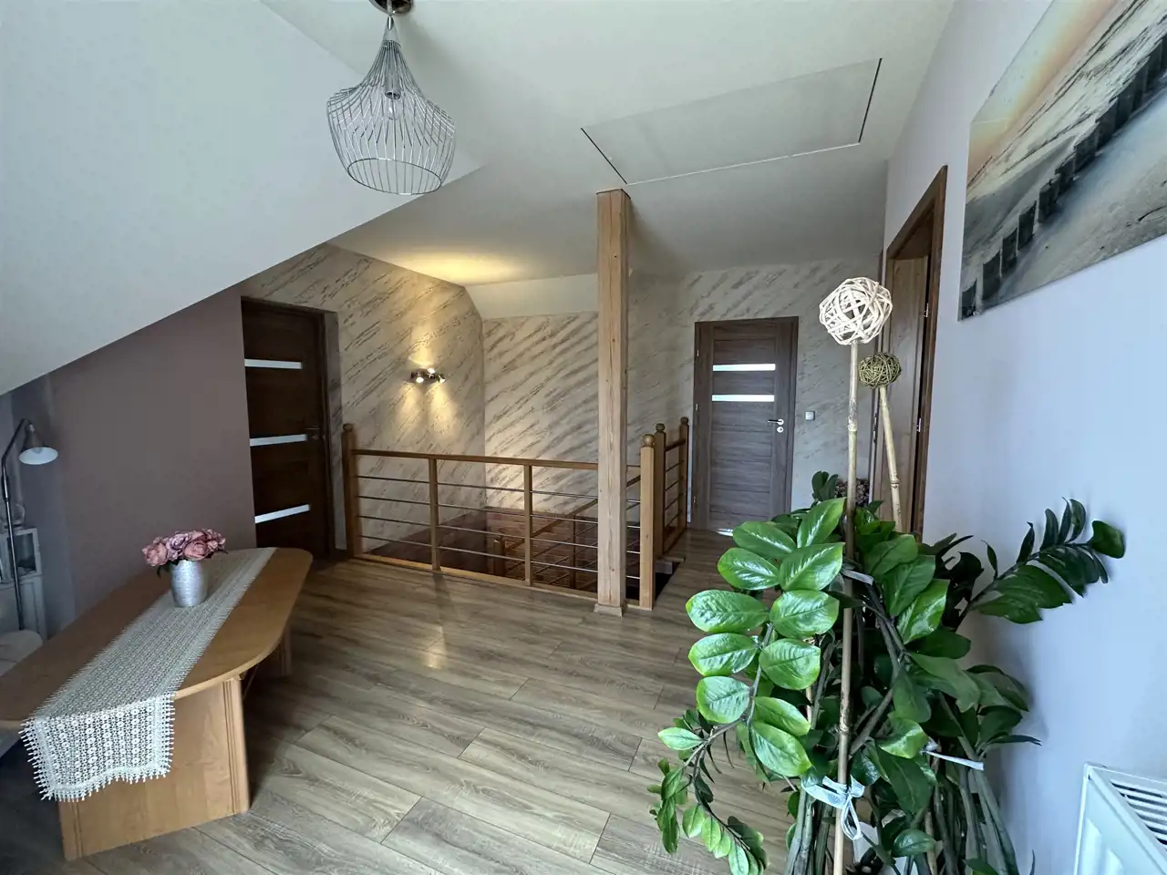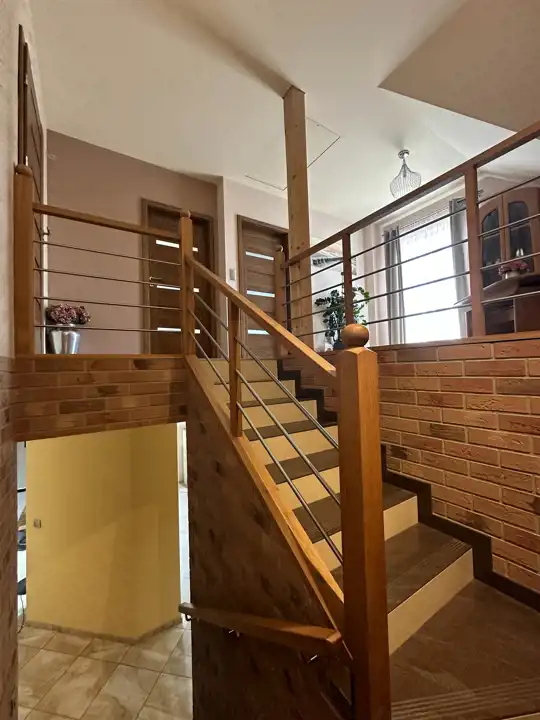 Dom bardzo zadbany i w całości wyposażony. Centralnym punktem domu jest salon z klimatycznym kominkiem i jadalnią z wyjściem na taras. Kuchnia w nowoczesnej zabudowie meblowej i pełnej zabudowie AGD + spiżarka. Na wyposażeniu łazienek zarówno prysznic jak i wanna. Na górze miejsce do odpoczynku (tzw. pomieszczenie rekreacyjne), może służyć jako gabinet, biblioteczka lub można przerobić na dodatkową sypialnię. Na poddaszu znajduje się mały stryszek.