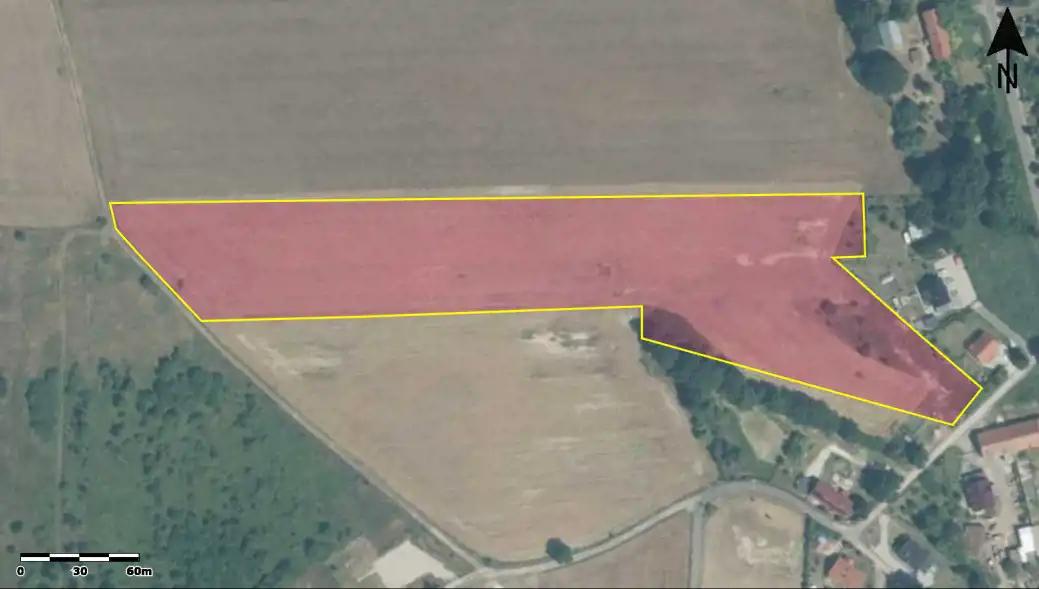 Sama działka ma powierzchnię ponad 2,5 ha, przy granicy w drodze gminnej dostępne są sieci: wodociągowa, kanalizacji sanitarnej oraz elektroenergetyczna.