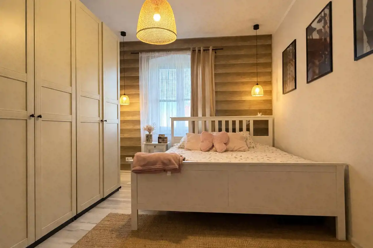 Wyposażenie i umeblowanie w cenie mieszkania: meble kuchenne w zabudowie, piekarnik, płyta gazowa, okap, lodówko-zamrażarka, zmywarka, pojemna szafa w zabudowie, meble łazienkowe, pralka, stół z krzesłami, sofa z funkcją spania, fotel, szafka RTV, witryna z szufladami, ława kawowa, łóżko sypialniane, szafka na buty.