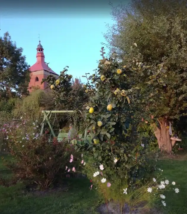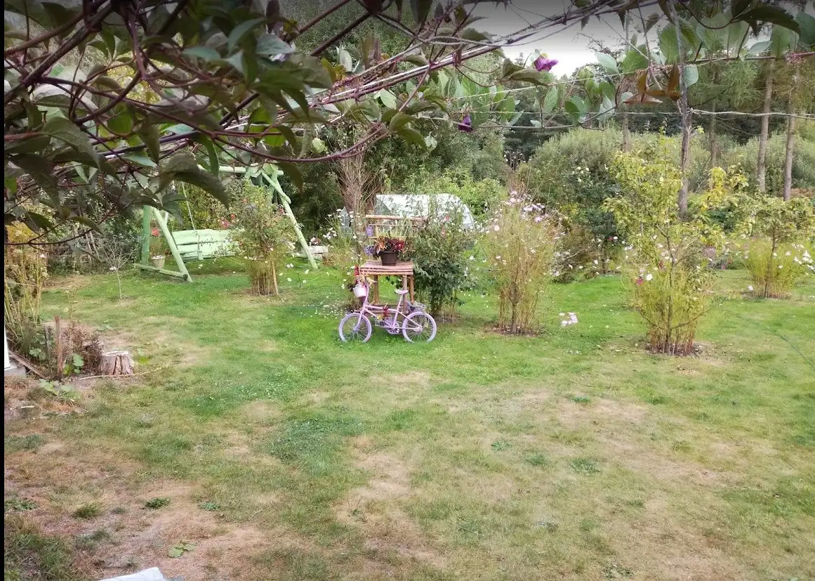 Działka jest zagospodarowana i zadbana. Wzdłuż wjazdu prowadzi szpaler drzew oraz nasadzenia kwiatowe, natomiast w dalszej części, w kierunku rzeczki, znajduje się ogród z warzywami i drzewami owocowymi.