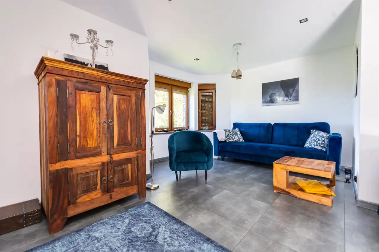 Parter to otwarta przestrzeń z nowoczesną kuchnią z wyspą, jadalnią i przestronnym salonem. Sercem salonu jest klimatyczny kominek, idealny na chłodniejsze wieczory. Z salonu jest bezpośrednie wyjście na taras.