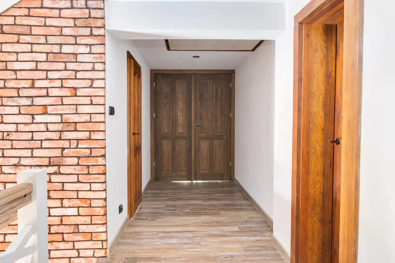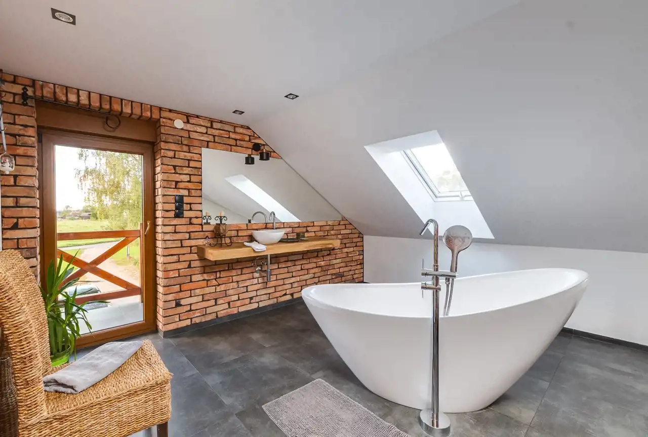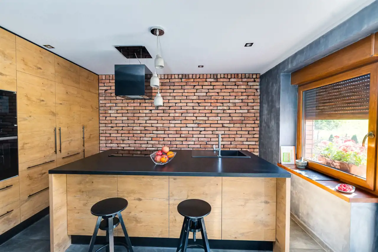 Ściany: akcent stanowią ściany wykończone dekoracyjną ciętą cegłą.