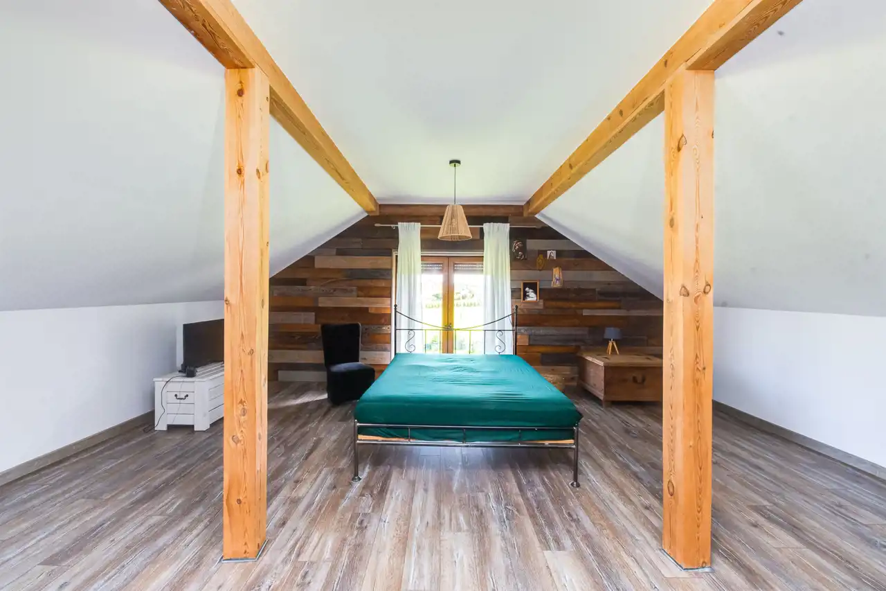 Sypialnia główna: ma aż 39,2 m2 i jest prawdziwą wizytówką domu. Wyróżnia ją unikalna ściana akcentowana, wykonana z różnego rodzaju drewna, która harmonijnie łączy się z wyeksponowanymi krokwiami.