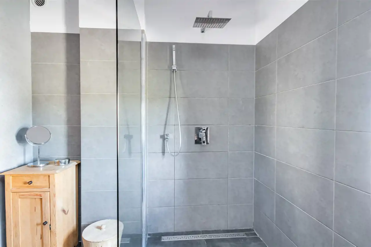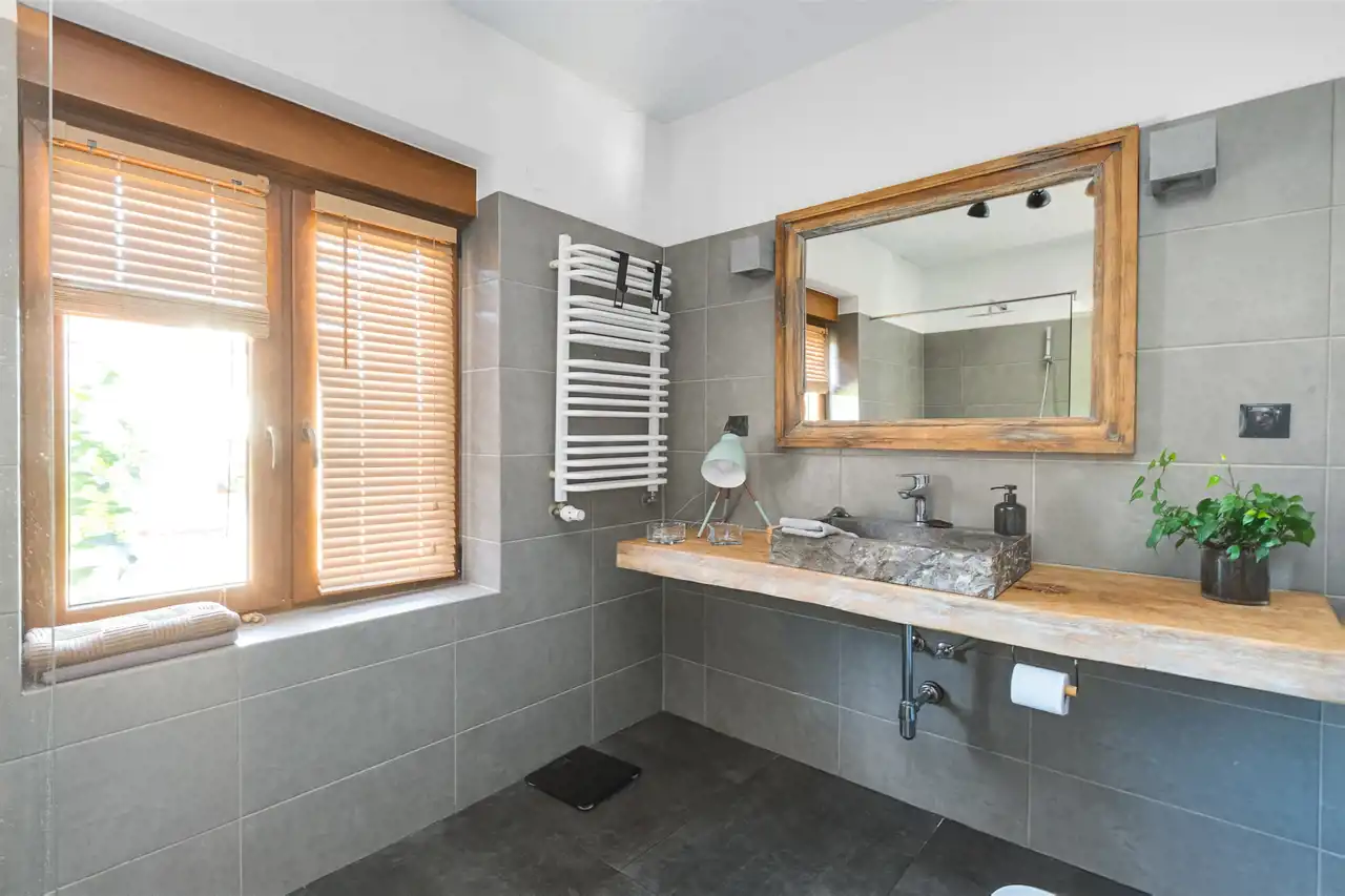 Łazienka na parterze: funkcjonalna łazienka z bardzo dużą kabiną prysznicową z odpływem liniowym. Ciekawy akcent stanowi umywalka z kamienia na solidnym dębowym blacie.