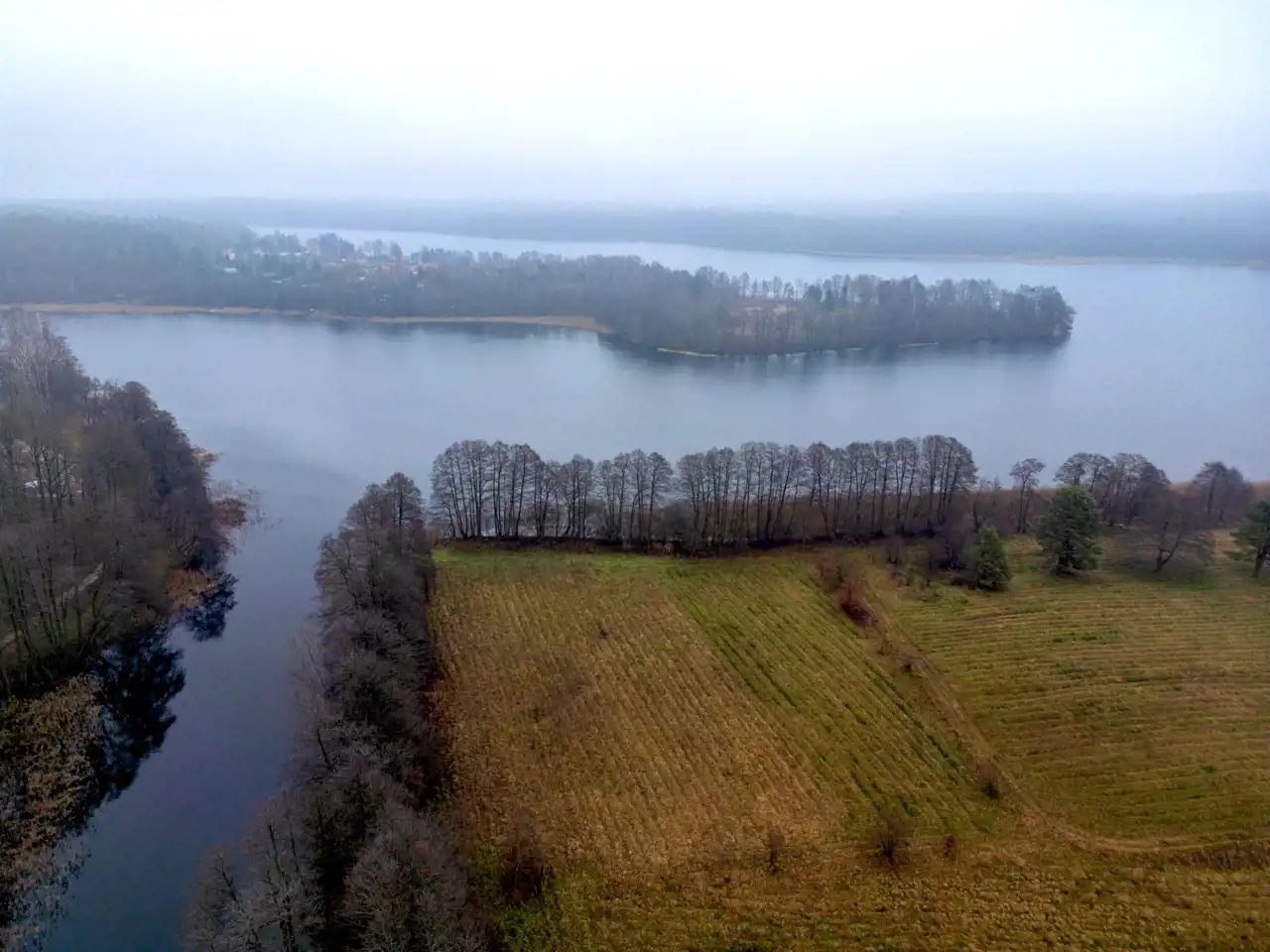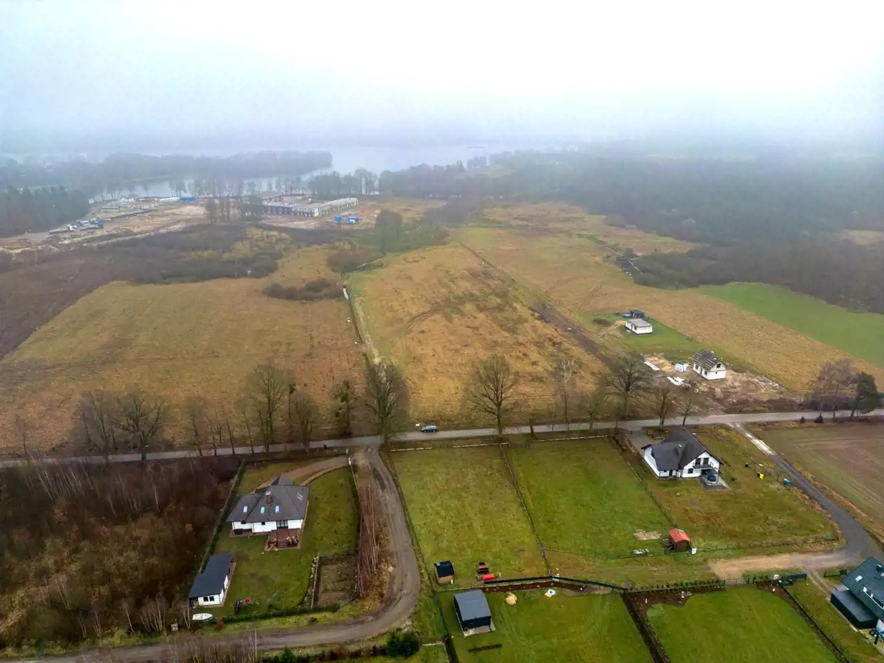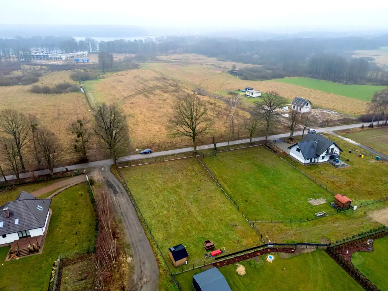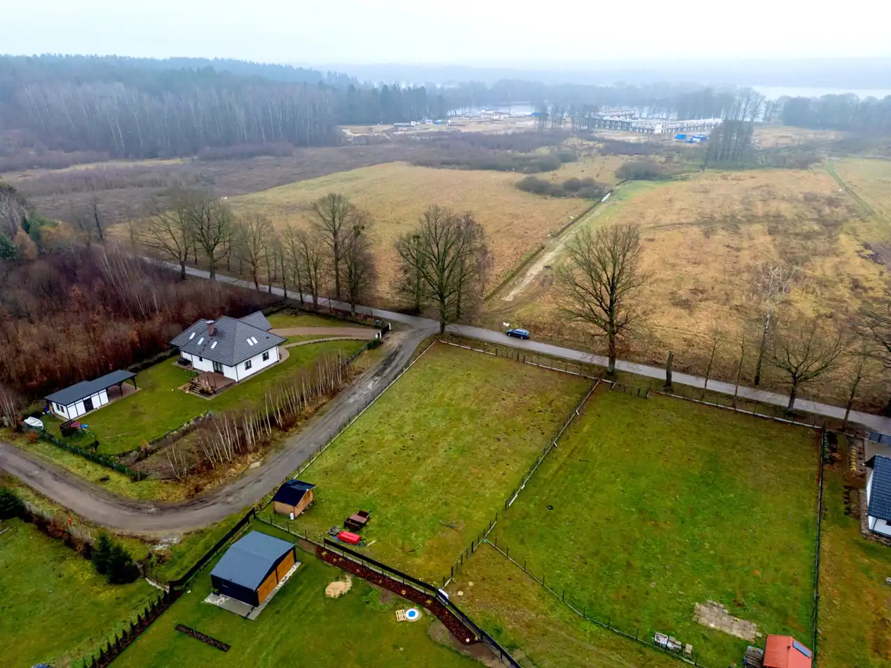 Jeziora nie są widoczne bezpośrednio z działki, co zapewnia większą prywatność i spokój, bez ruchu turystycznego pod samym domem.