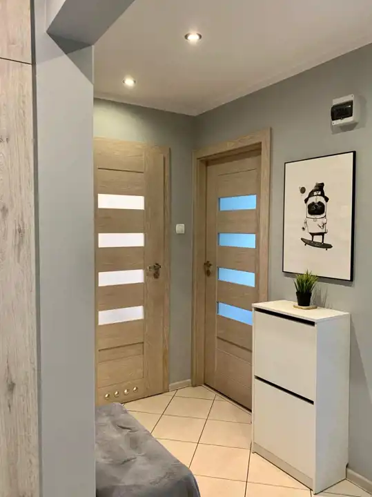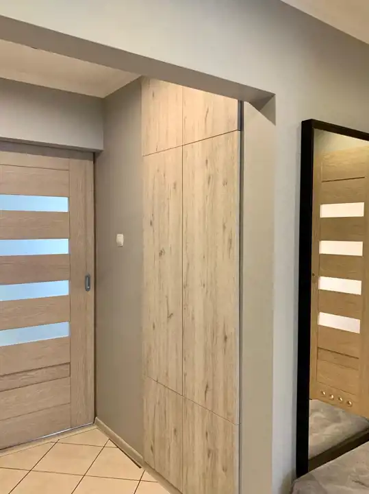 Przedpokój zabudowany szafami i pawlaczami co stanowi doskonałe dodatkowe miejsce do przechowywania.